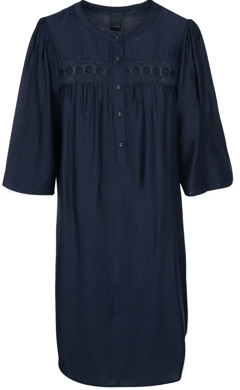 Fin og enkel kjole i navy med detaljer over brystet. En komfortabel kjole til enhver anledning.