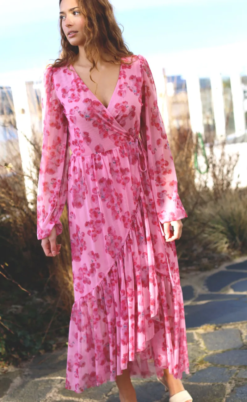 Blomstret maxi kjole fra Cras i et lyserødt print, med en v-hals og bindedetalje i siden.