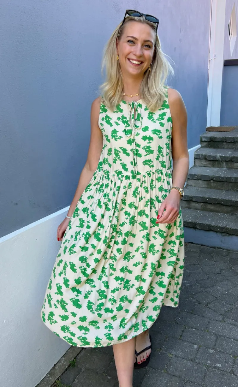 Fin kjole fra INA Copenhagen i hvid med grønne blomster.