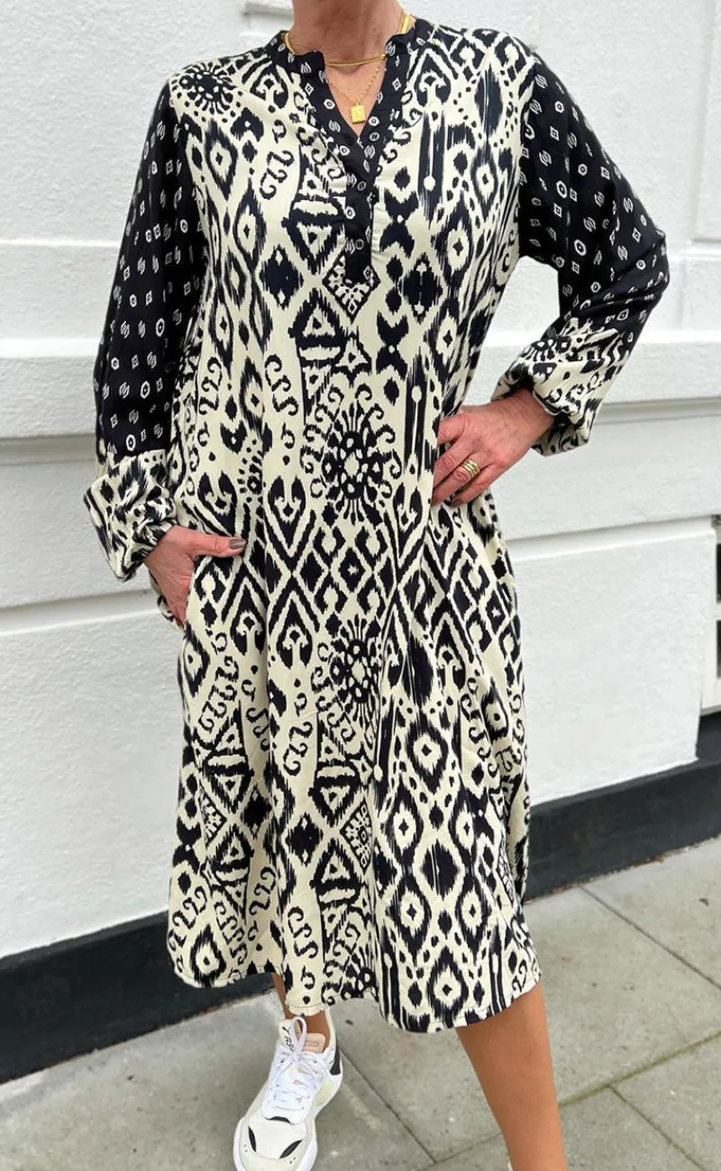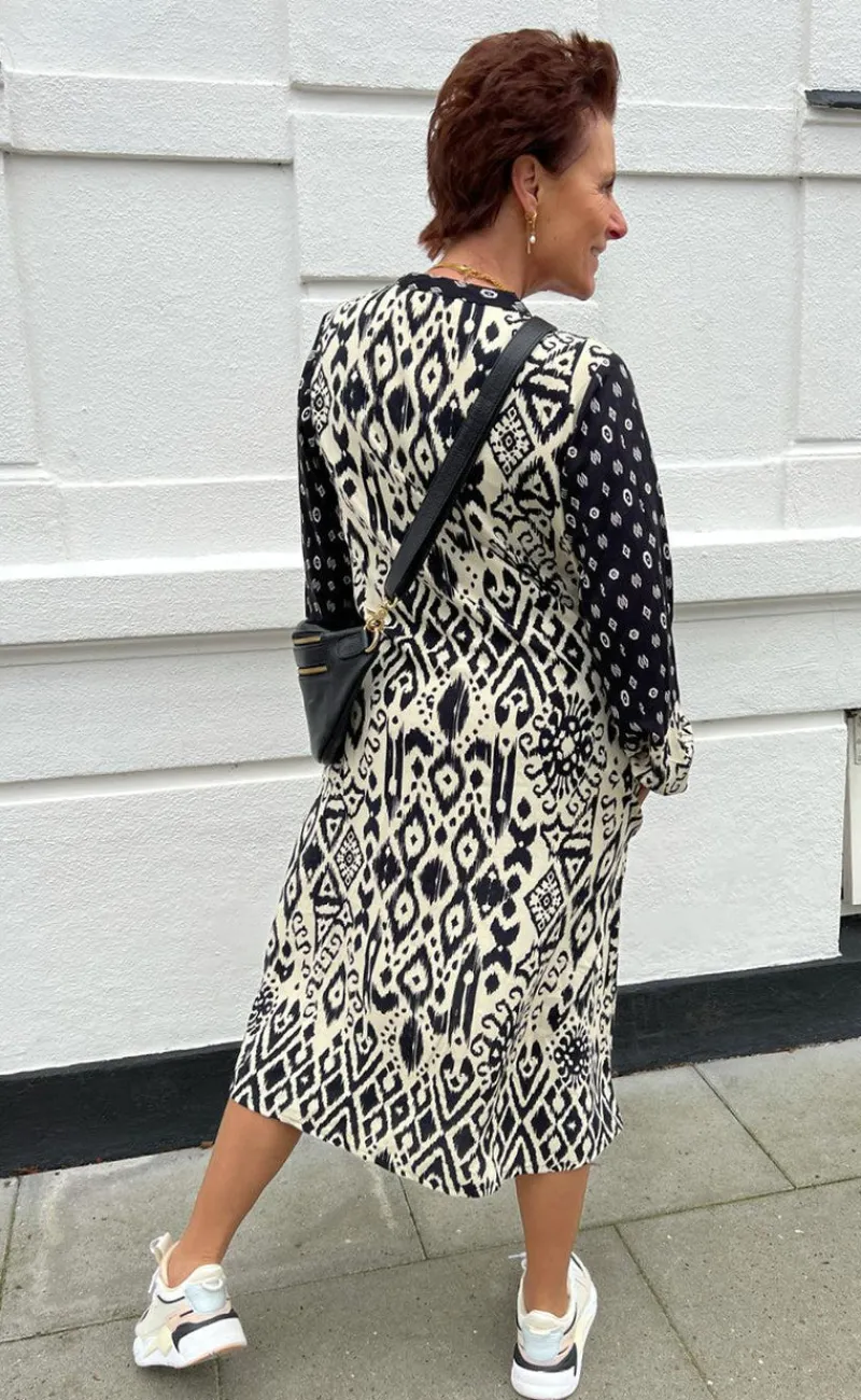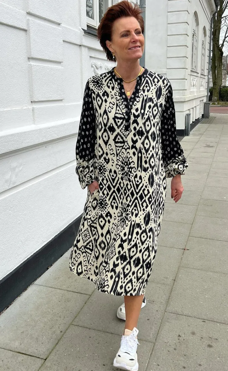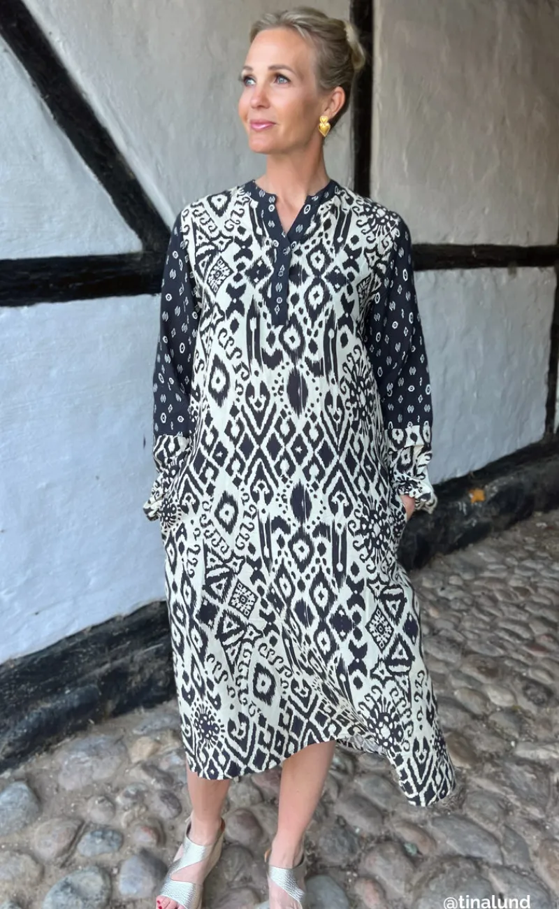 Flot kjole kjole fra INA Copenhagen med print i sort og off-white.