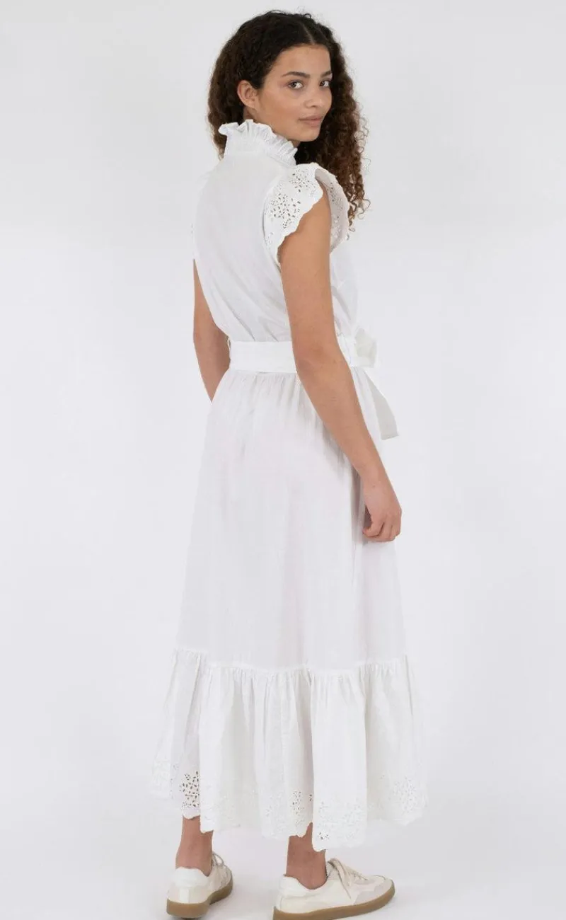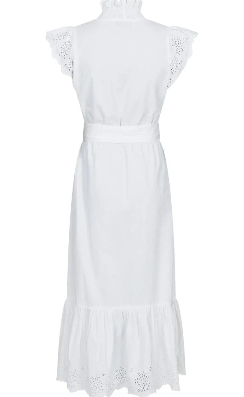 Kjolen har fine broderi anglaise detaljer, en v-hals samt en stor bindesløjfe i taljen.