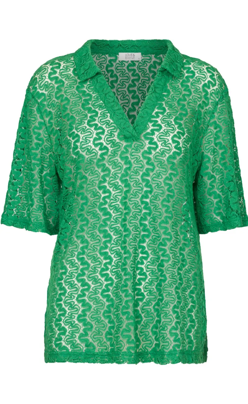 Grøn bluse fra Love & Divine i en let gennemsigtig kvalitet.