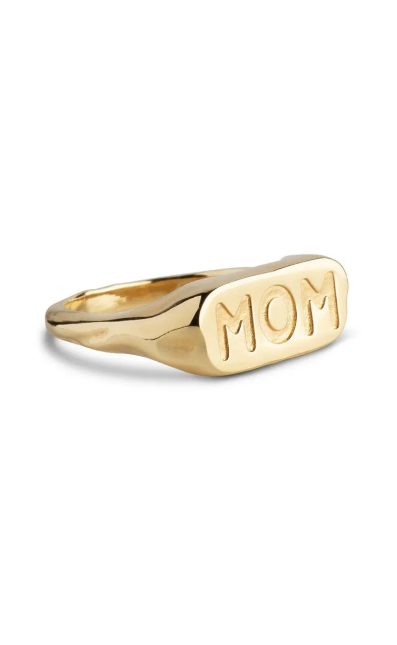 Fin og rustik ring fra ENAMEL Copenhagen i guld med ordet “Mom” stående som hovede element på ringen.