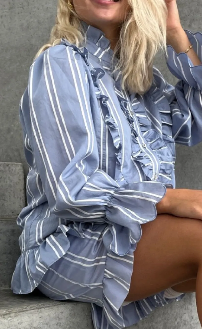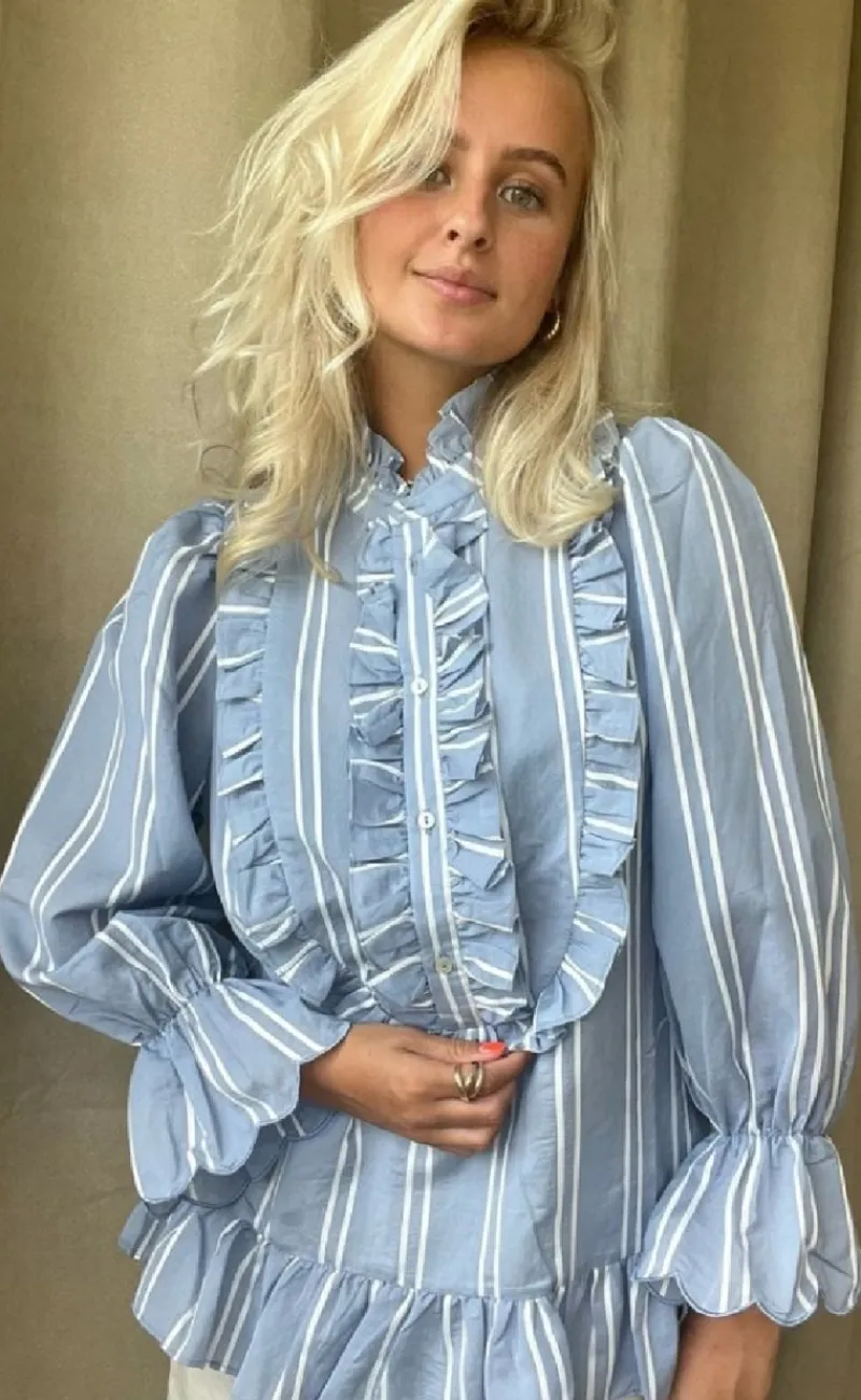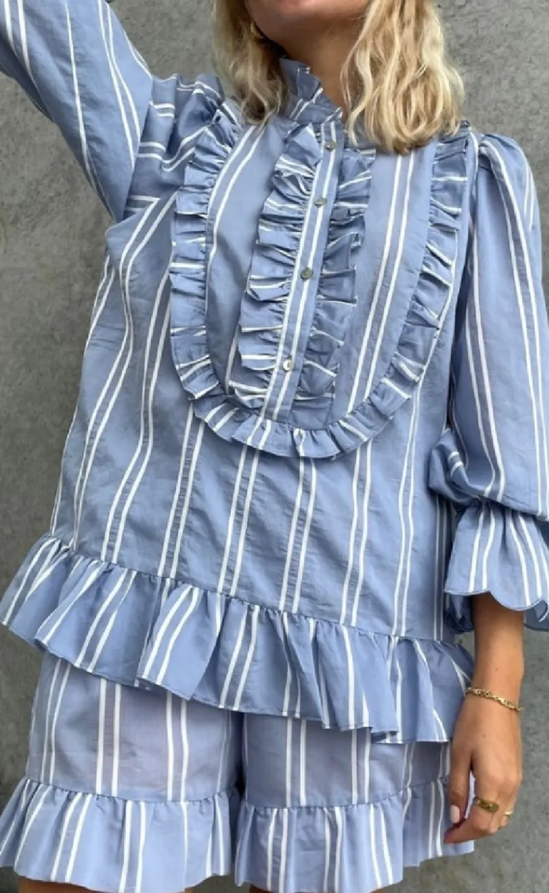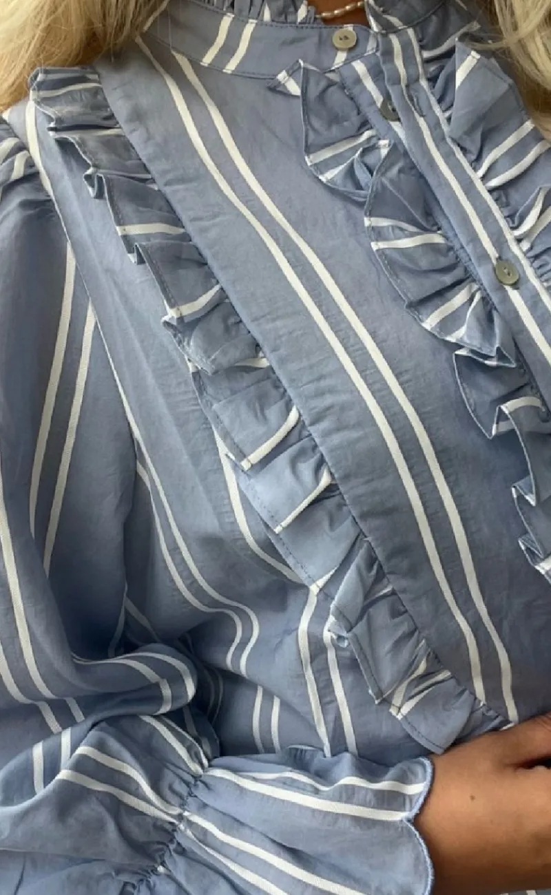 Lyseblå skjorte med hvide striber fra Stories From The Atelier med feminine detaljer.