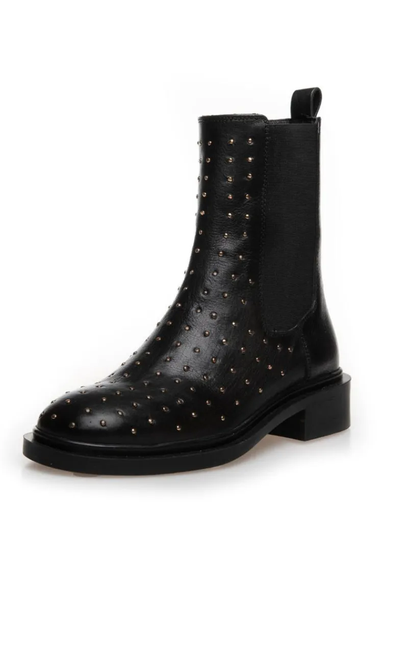 Støvlerne kommer i en skinnende farve og har guld nitter rundt. De har en tynd sål og elastik i siderne, som gør dem nemmere at komme i.