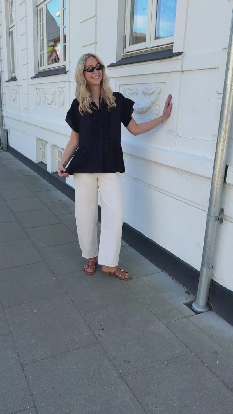 Toppen har et oversize fit, flæse-ærmer og en åbning fortil med flæser omkring.