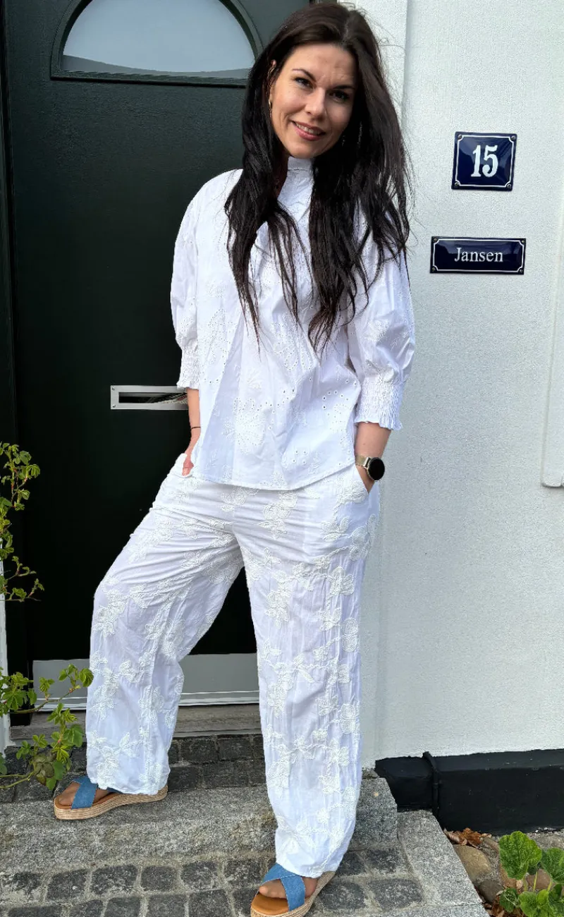 Mønstrede bukser fra Marta Du Chateau i hvid, med hvide detaljer.
