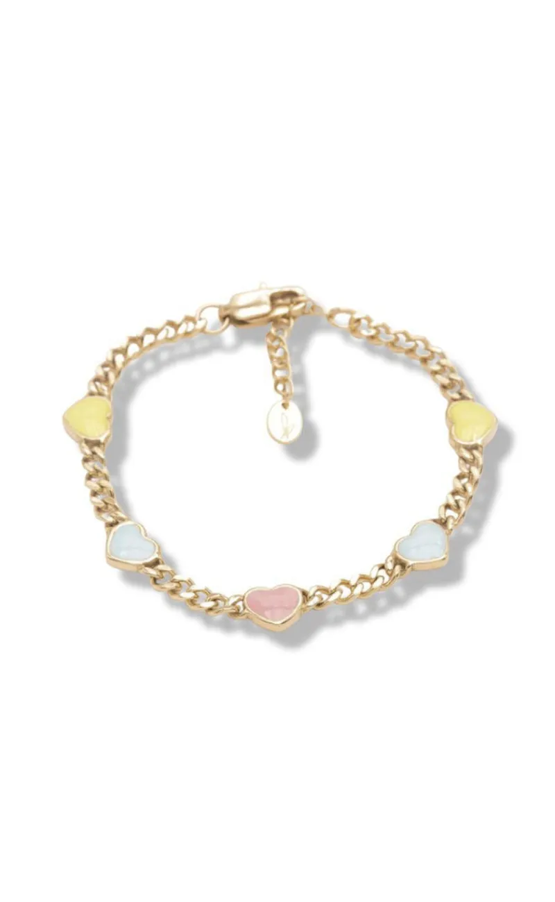 Flot armbånd fra Smykkeli Copenhagen i guld med 5 hjerteformede emaljer i forskellige pastel farver.