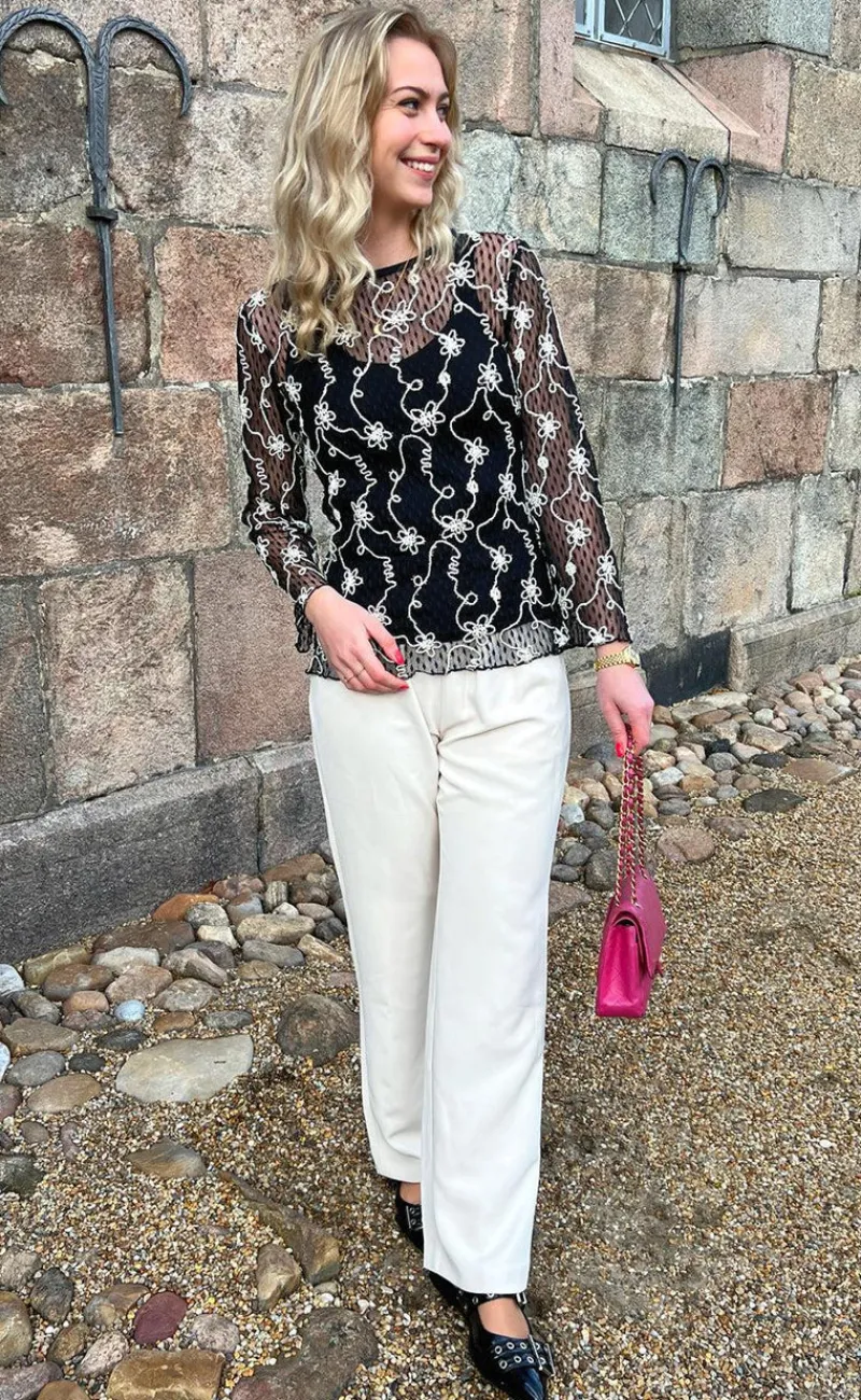 Virkelig smuk bluse fra INA Copenhagen i sort blonde-materiale med broderede blomster i hvid med glitter.
