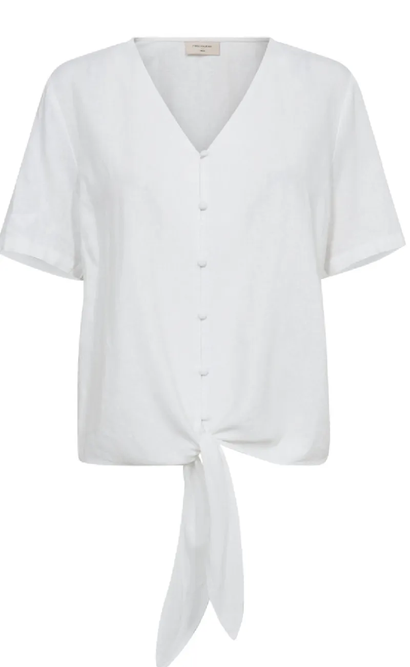 Flot hør bluse fra Freequent i hvid, med en fin wrap detalje fortil.