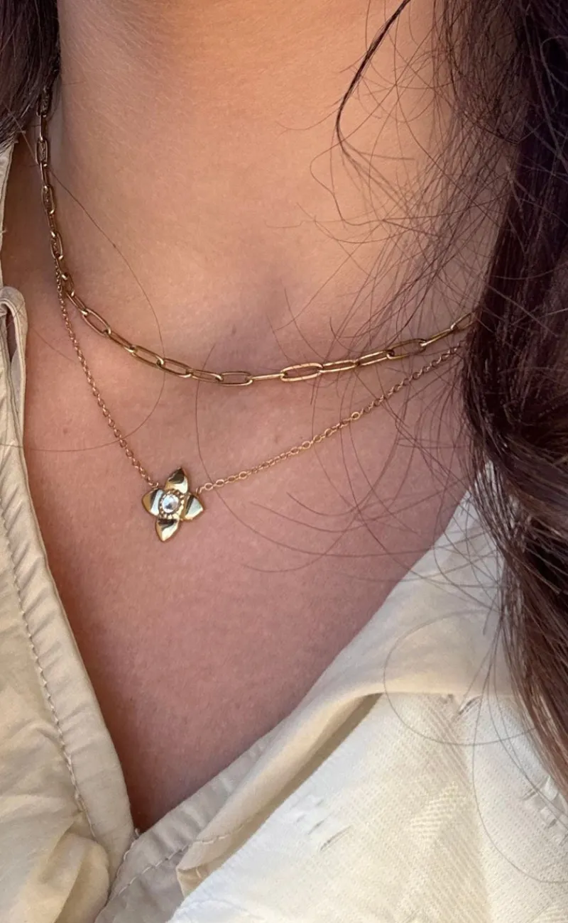 Fin halskæde fra Smykkeli Copenhagen i guld med et vedhæng formet som en blomst med zirconia sten.