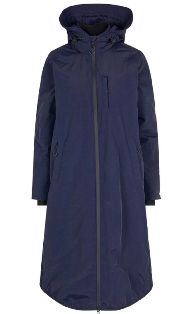 Jakken går til omkring knæene, har en gennemgående lynlås og rumlige lommer.