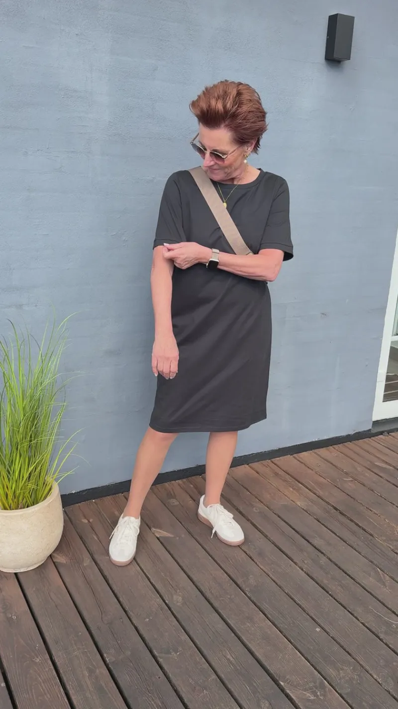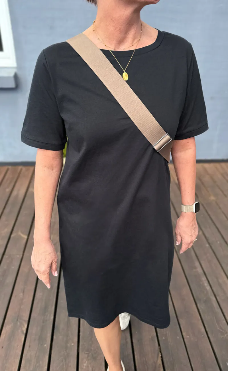 Kjolen har korte ærmer, en rund halsudskæring og er fremstillet i en virkelig lækker bomuldskvalitet.