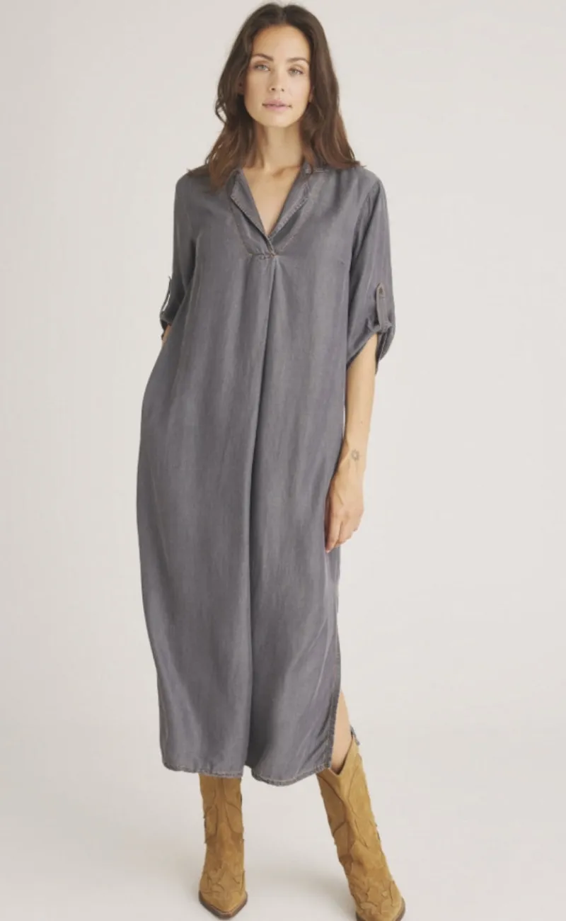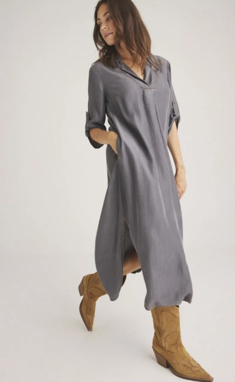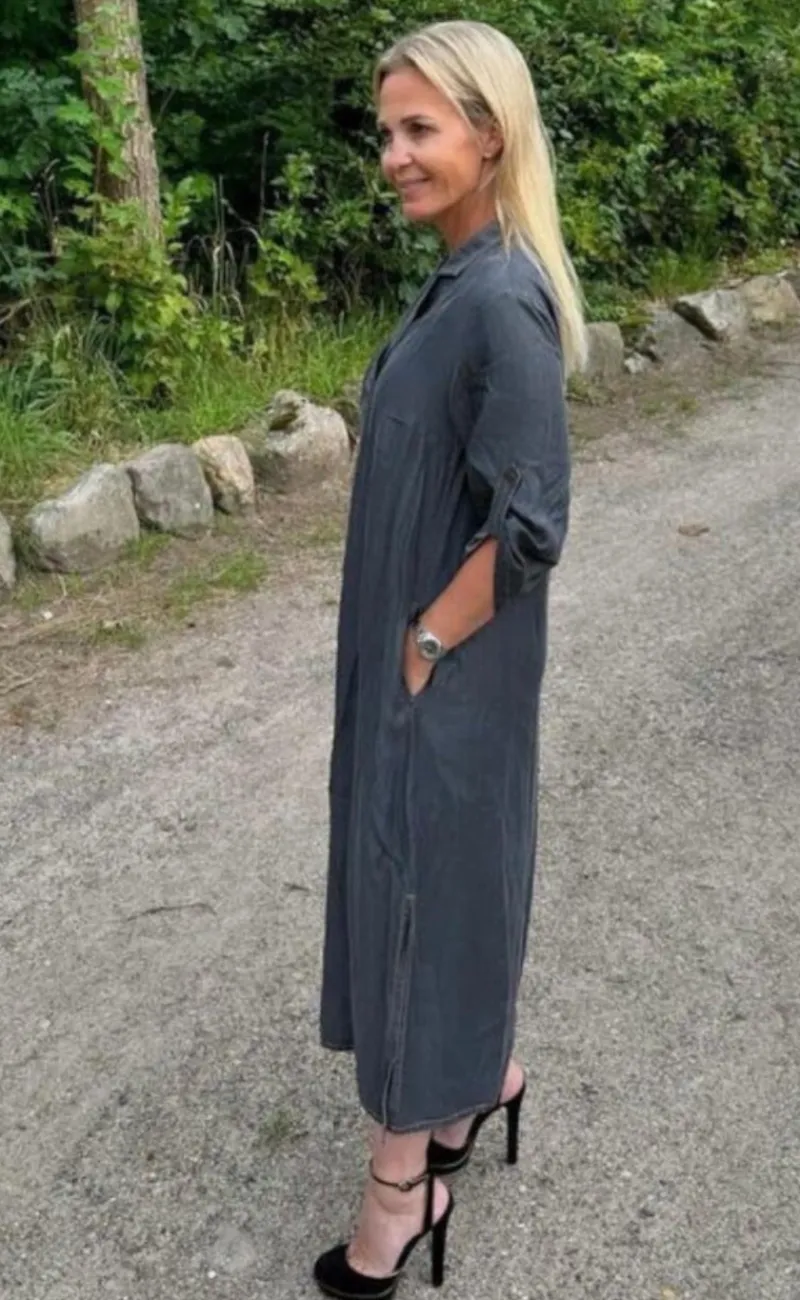Denne kjole er i et skinnede matriale, og så har den et denim look.