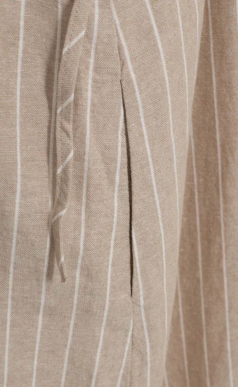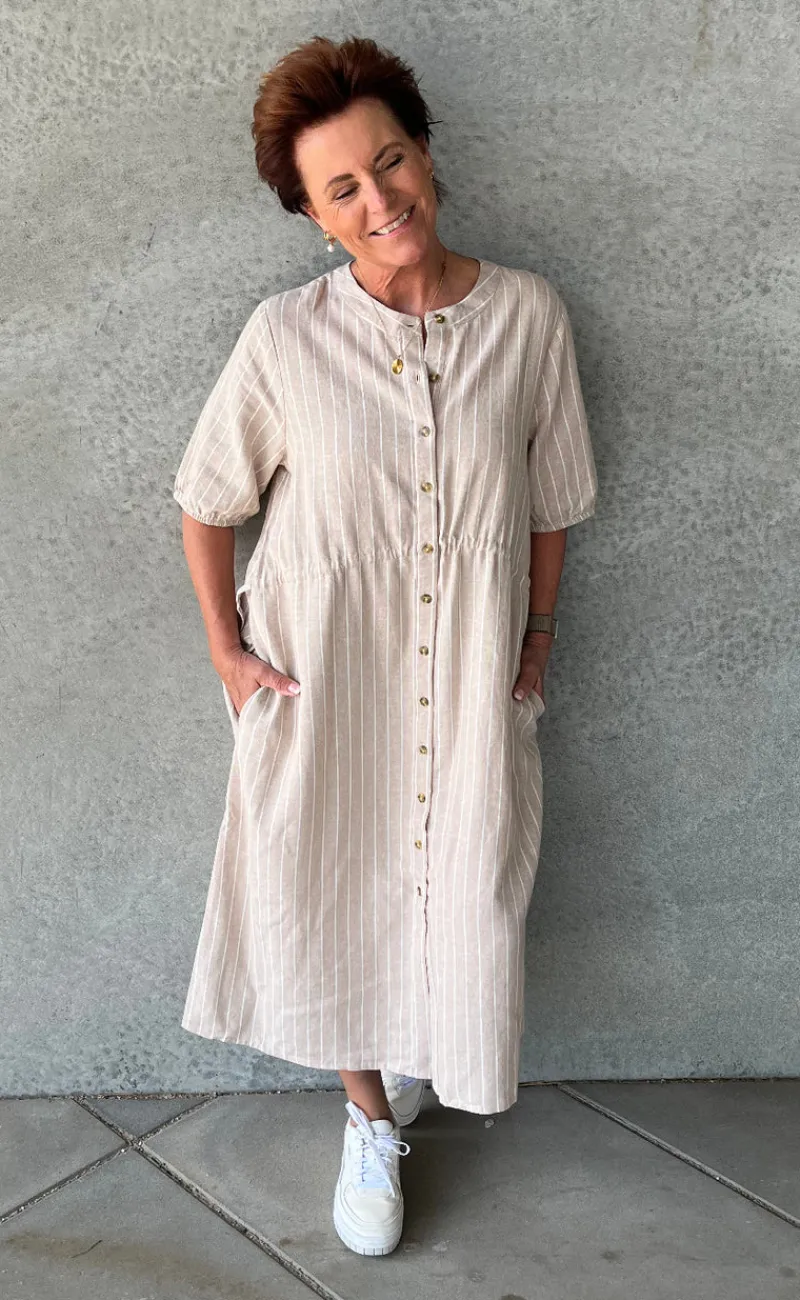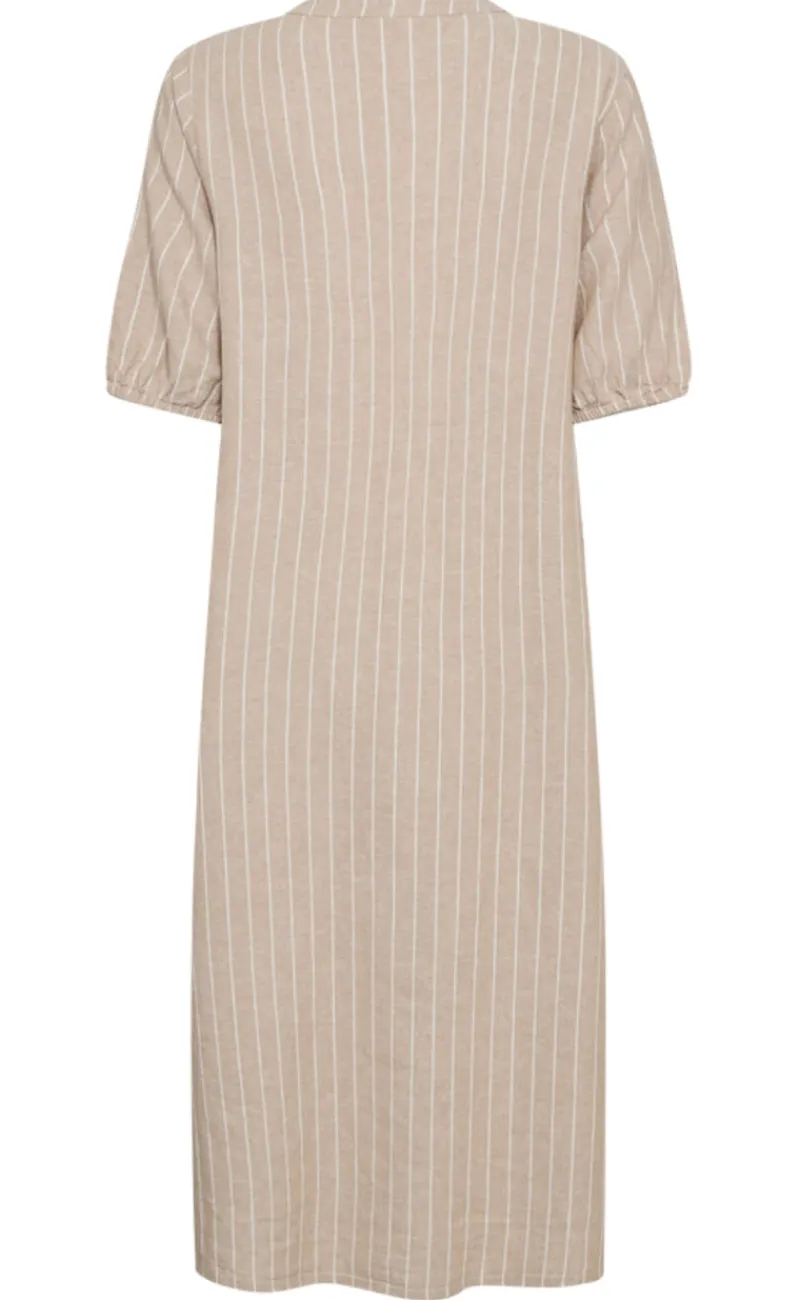 Kjolen har korte ærmer, knapper lang ned og detalje i taljen.