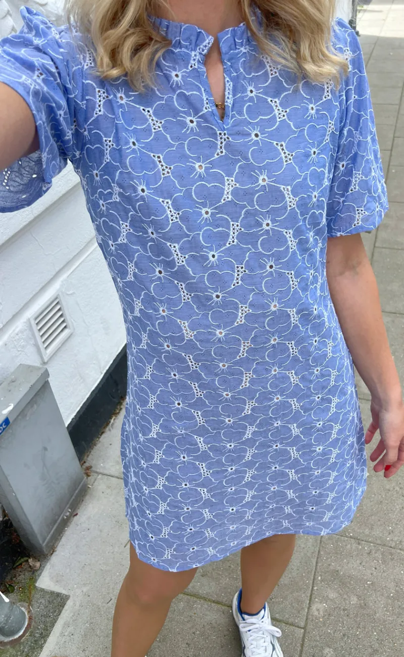 Den smukkeste kjole fra INA Copenhagen i blå med broderede blomster i hvid.