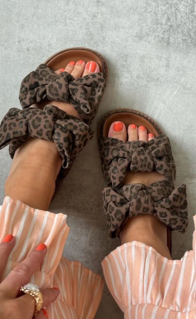 Disse sandaler kombinerer komfort med et stilrent design, der passer til de varme sommerdage. De har to store sløjfer på toppen.