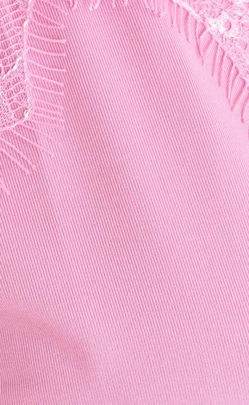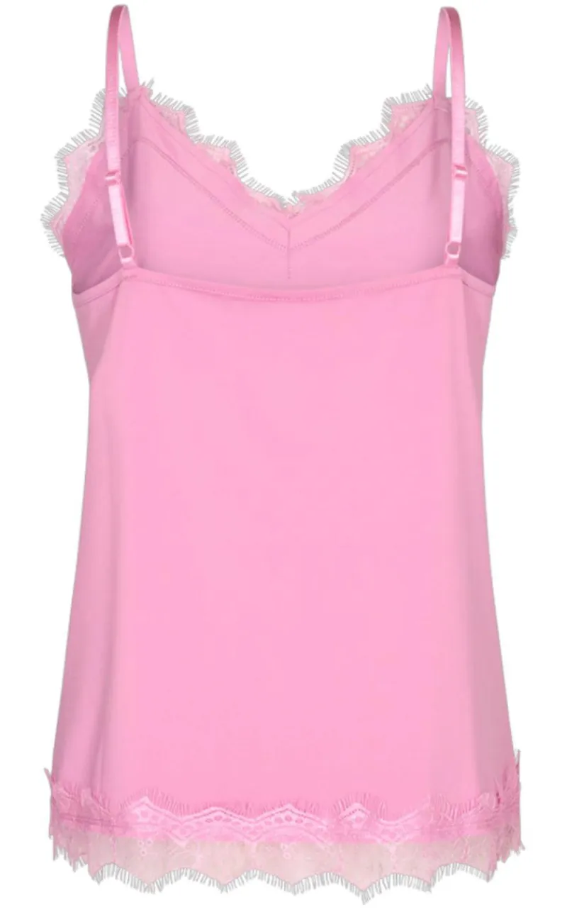 Toppen har v-hals og justerbare stropper, så den kan tilpasses efter behov. Der er blonder ved halsen og i bunden af toppen.