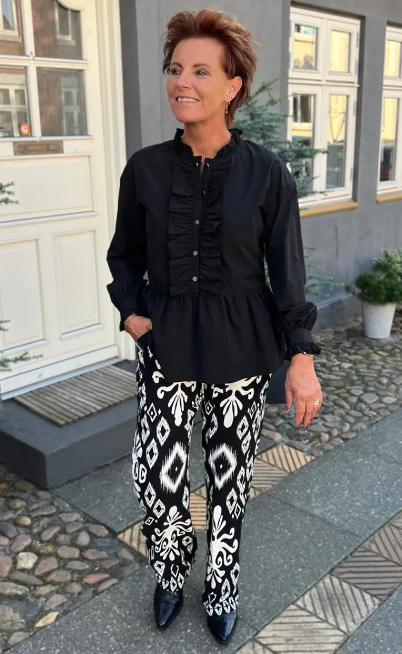 Elegant bluse med knapper på ærmet og ned langs. Blusen er sort og har de smukkeste flæser.