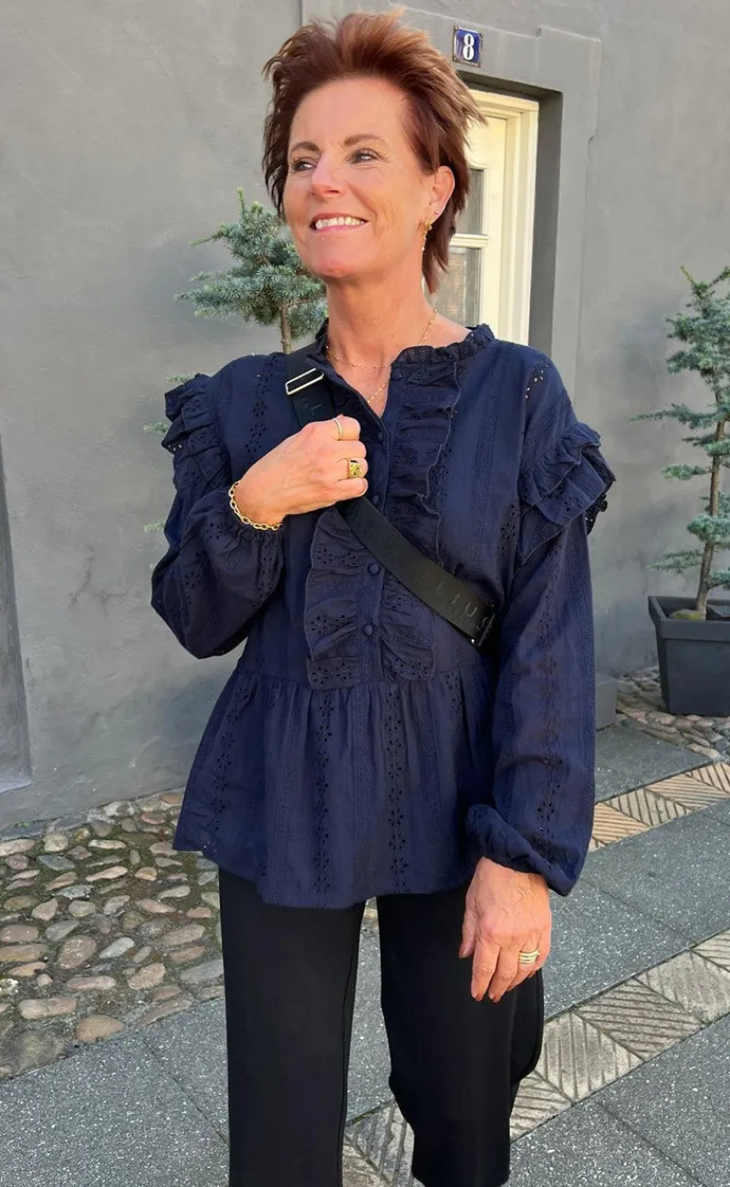 Smuk bluse fra INA Copenhagen i navy blå broderie anglaise.