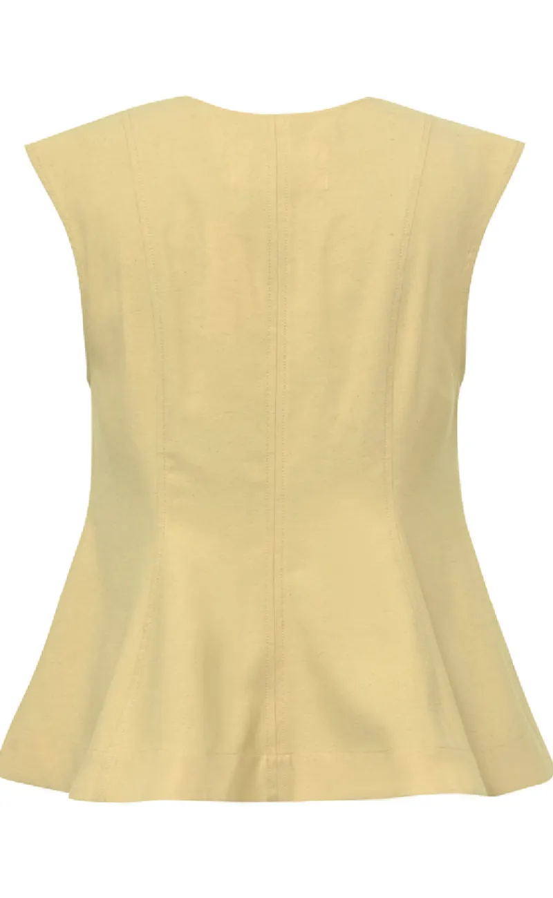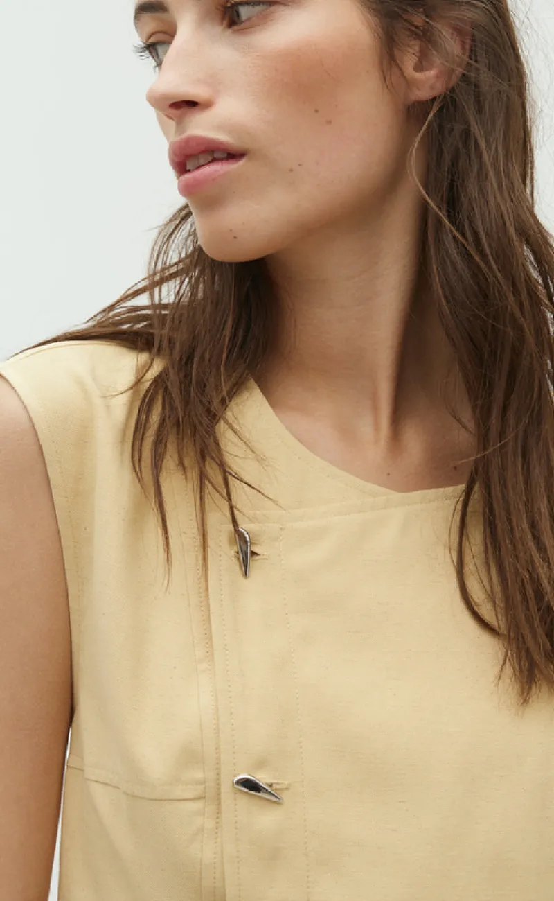 Blusen er ærmeløs og har en flot detalje fortil.
