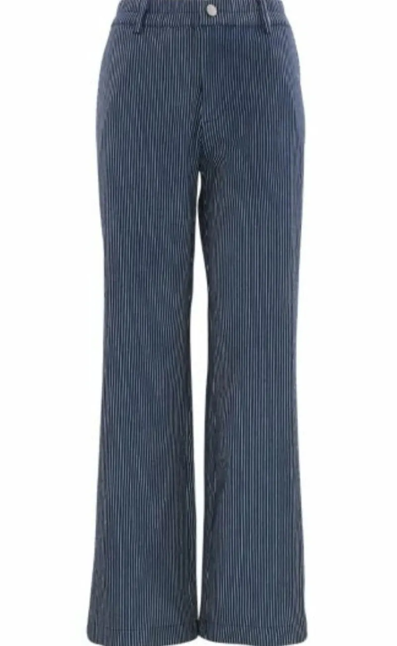 Smarte bukser i blå med små hvide striber. Bukserne har også vide ben