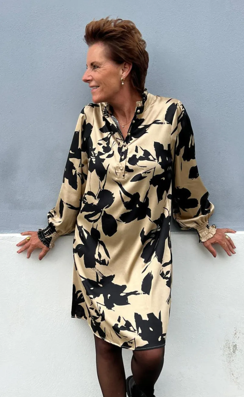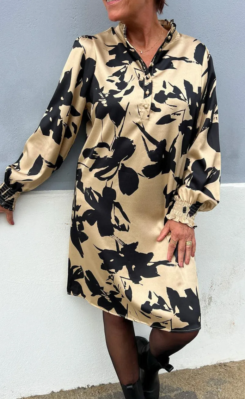 Smuk kjole fra INA Copenhagen i en camel nuance med sorte blomster.