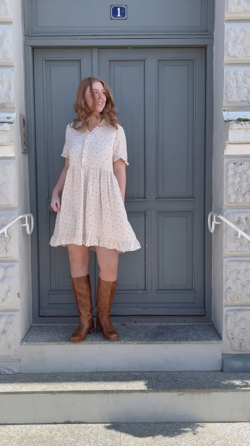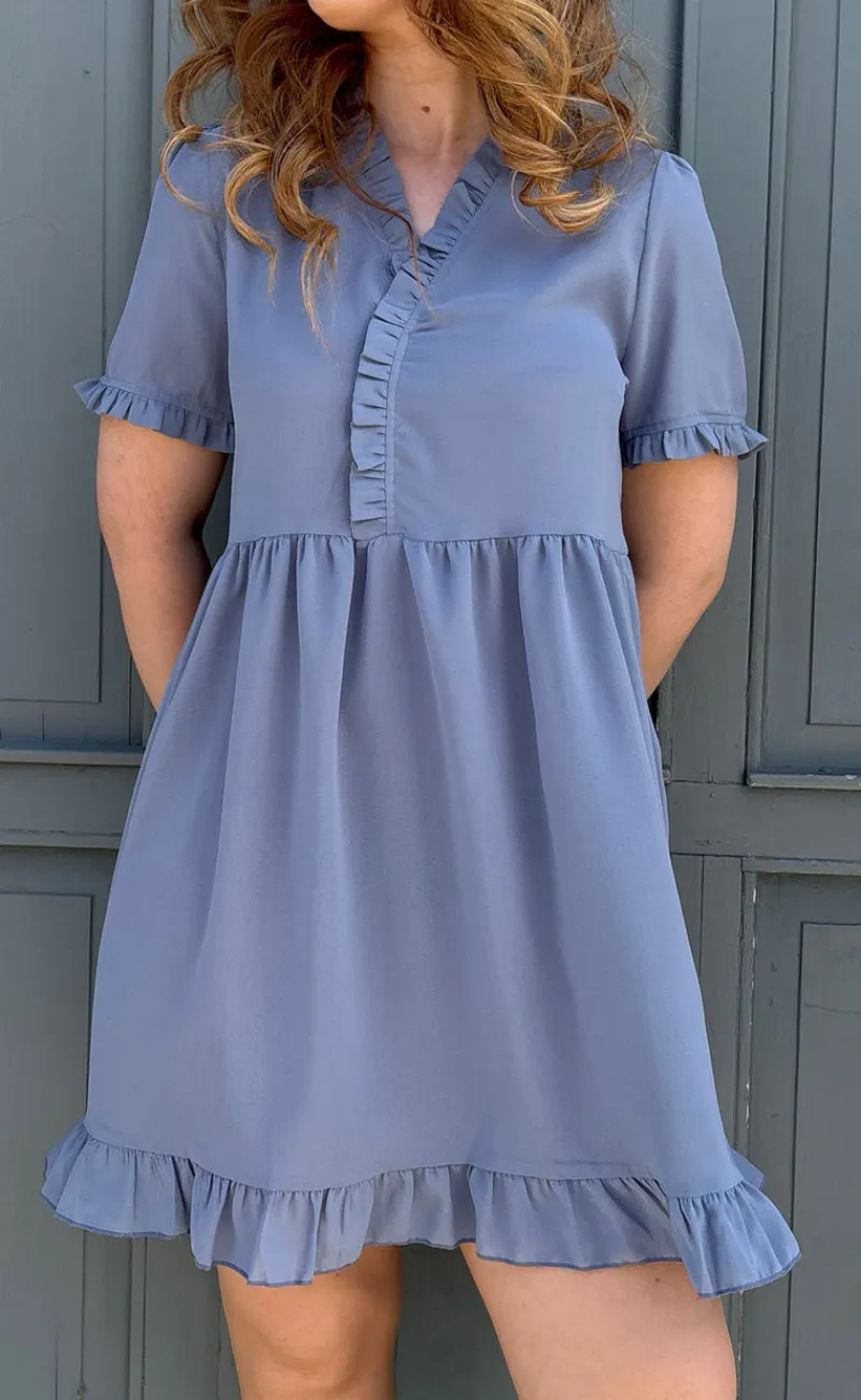 Kjolen har korte ærmer og de fineste detaljer med flæser ved halsen, ærmerne og i bunden af kjolen.