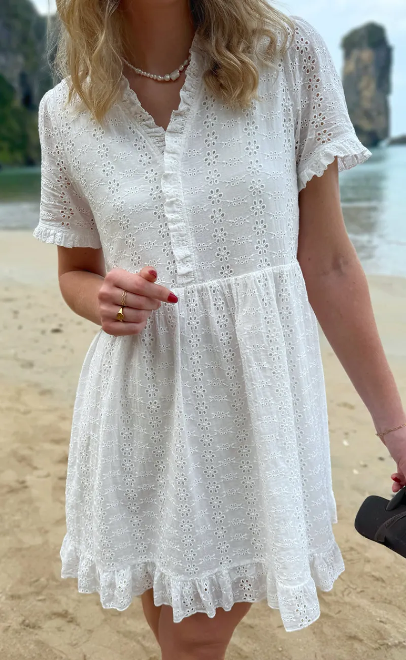 Smuk kjole fra INA Copenhagen i hvid broderie anglaise med så mange fine detaljer.
