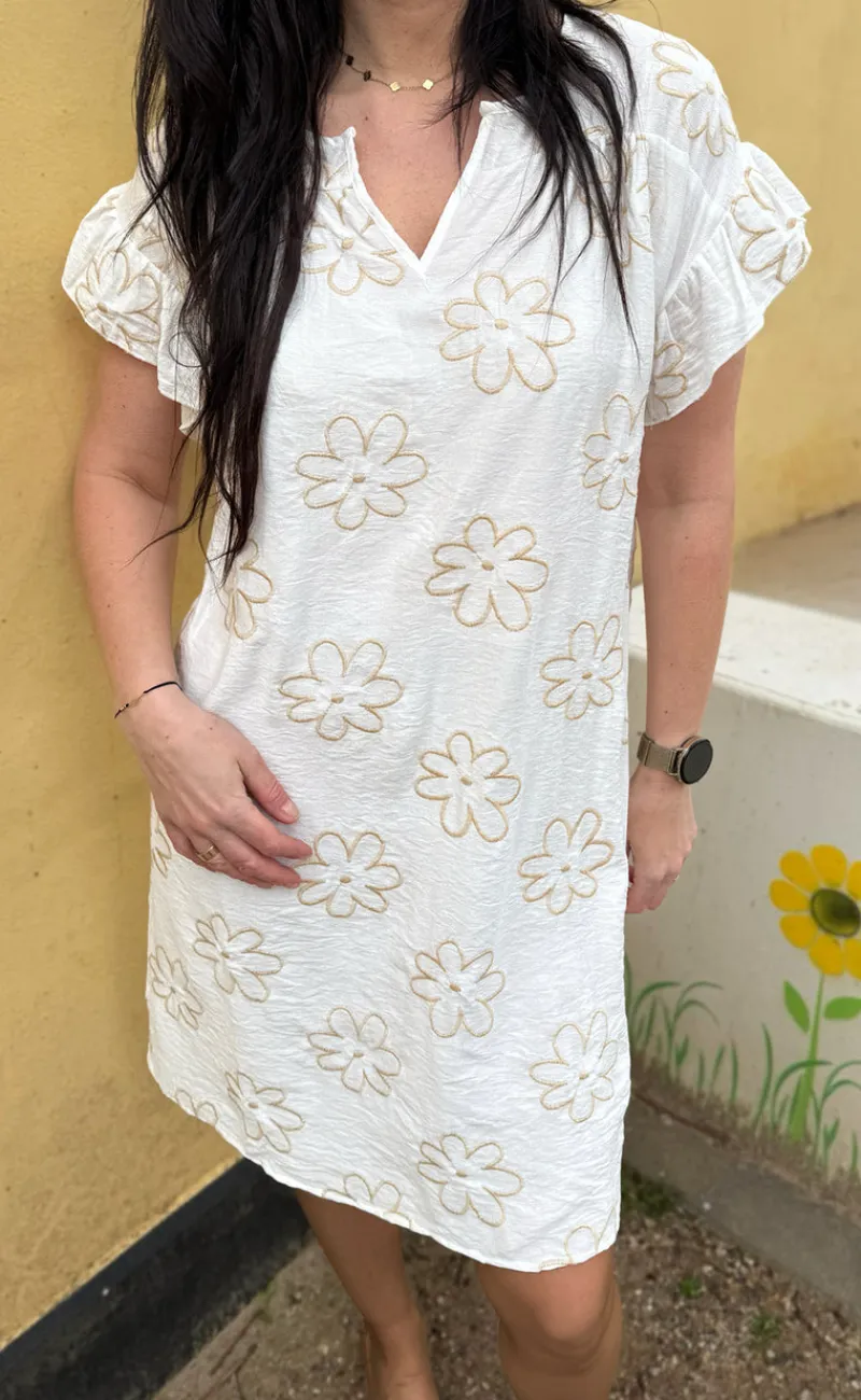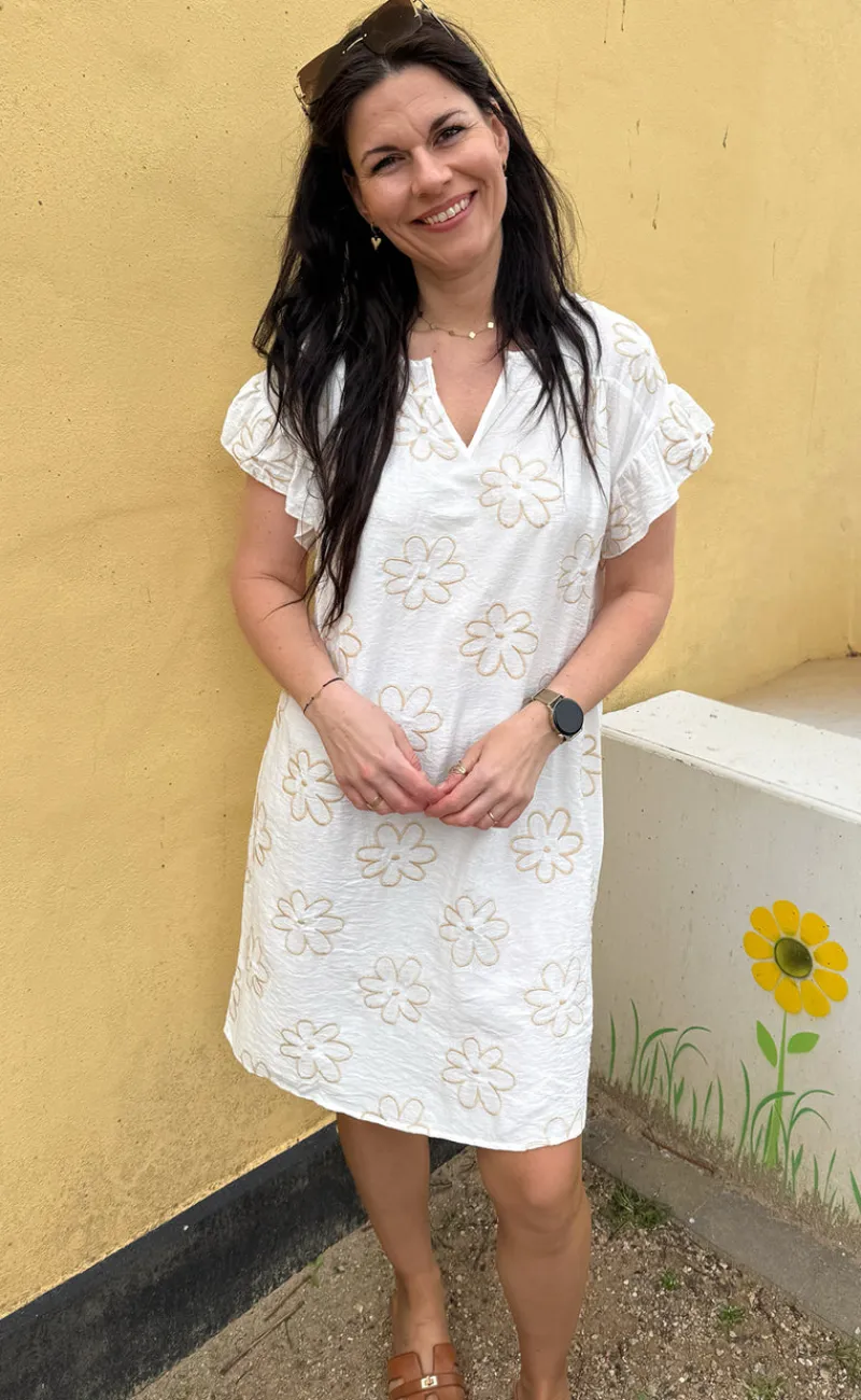 Skøn kjole fra INA Copenhagen i hvid med broderede blomster i camel.