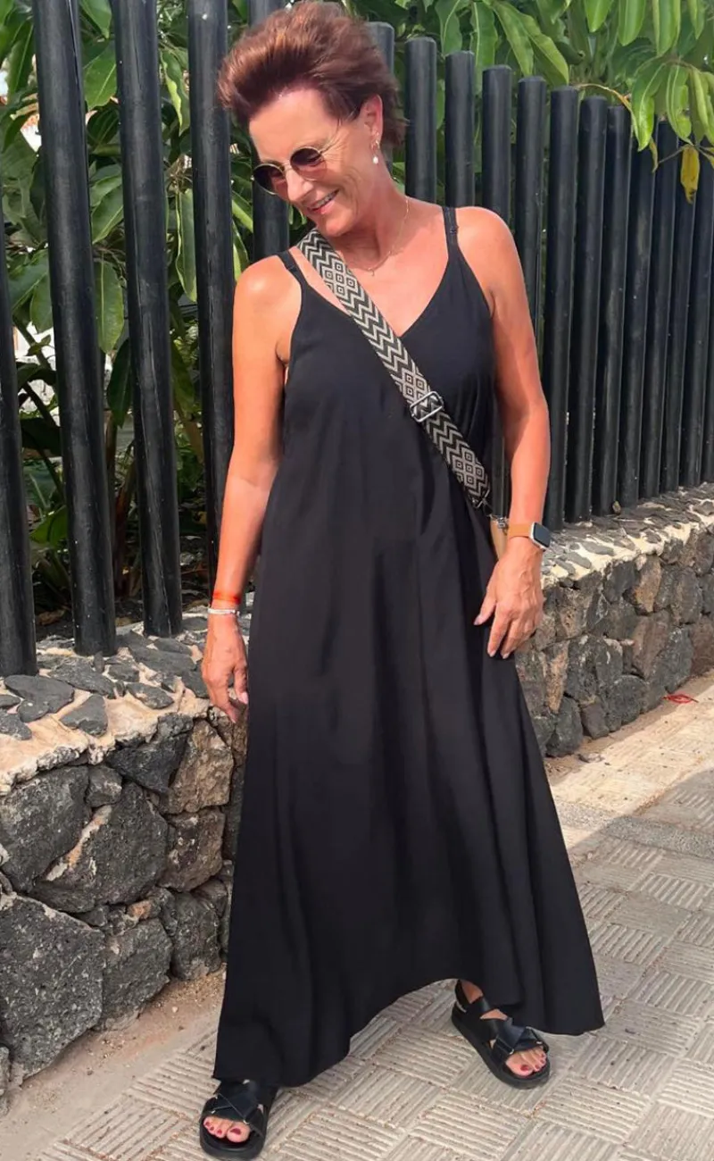 Kjolen har justerbare stropper og har en smule mere længde i siderne, så den falder utrolig flot langs kroppen.
