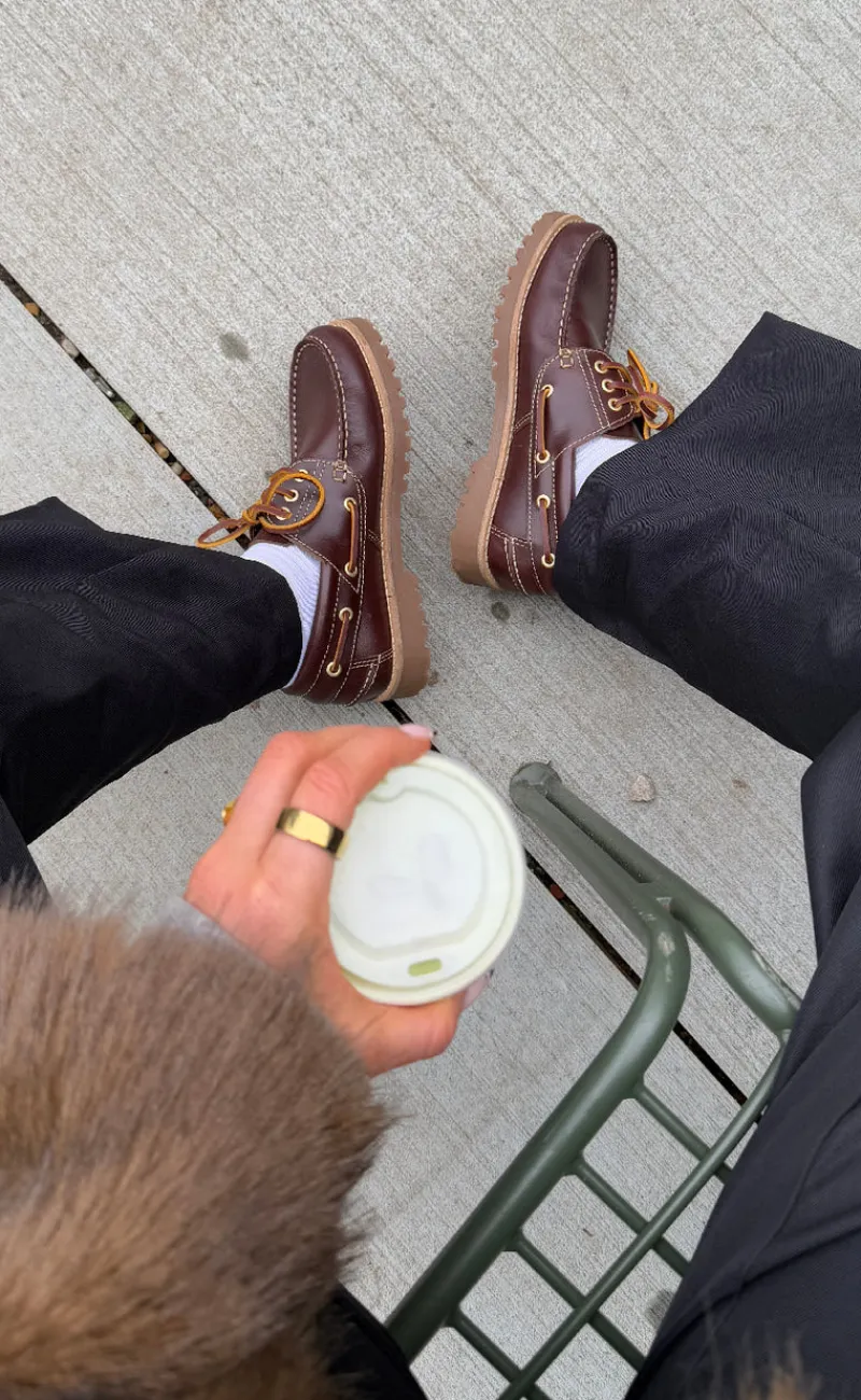 Moderne loafers fra Phenumb i brun, med fede kontrast syninger.