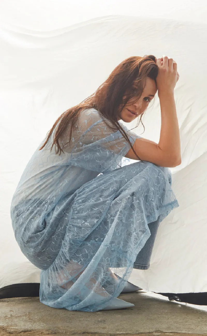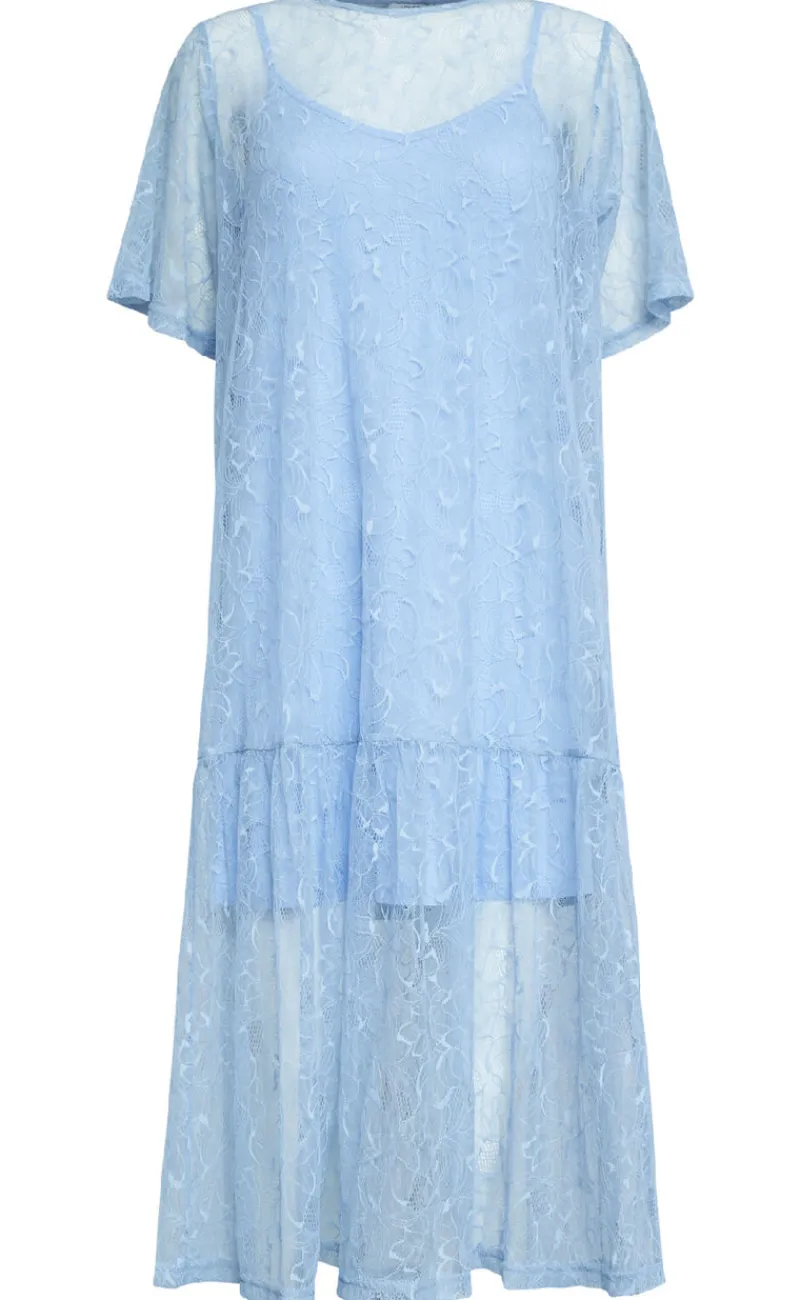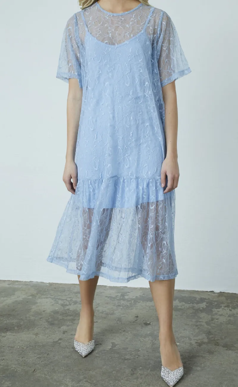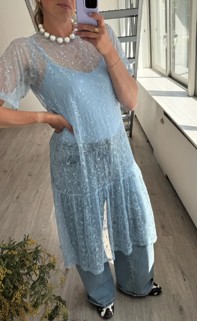 Smuk blondekjole fra Love & Divine i blå, med korte ærmer og en løs pasform, der falder til midt på skinnebenet.
