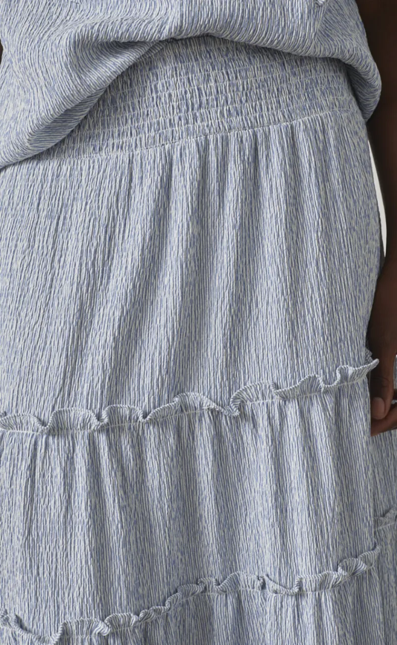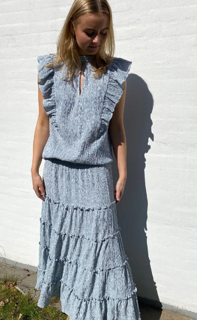 Nederdelen er lang og løs med fine enkelte detaljer.