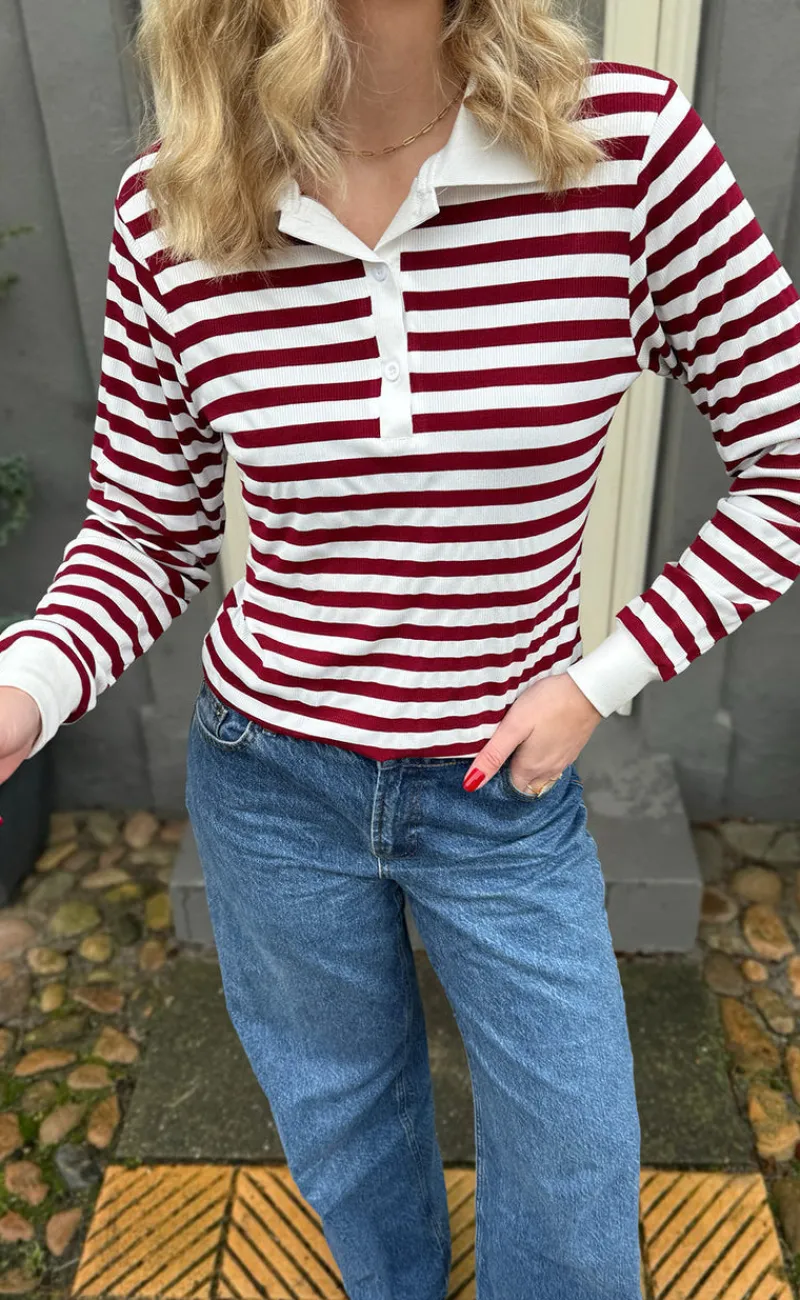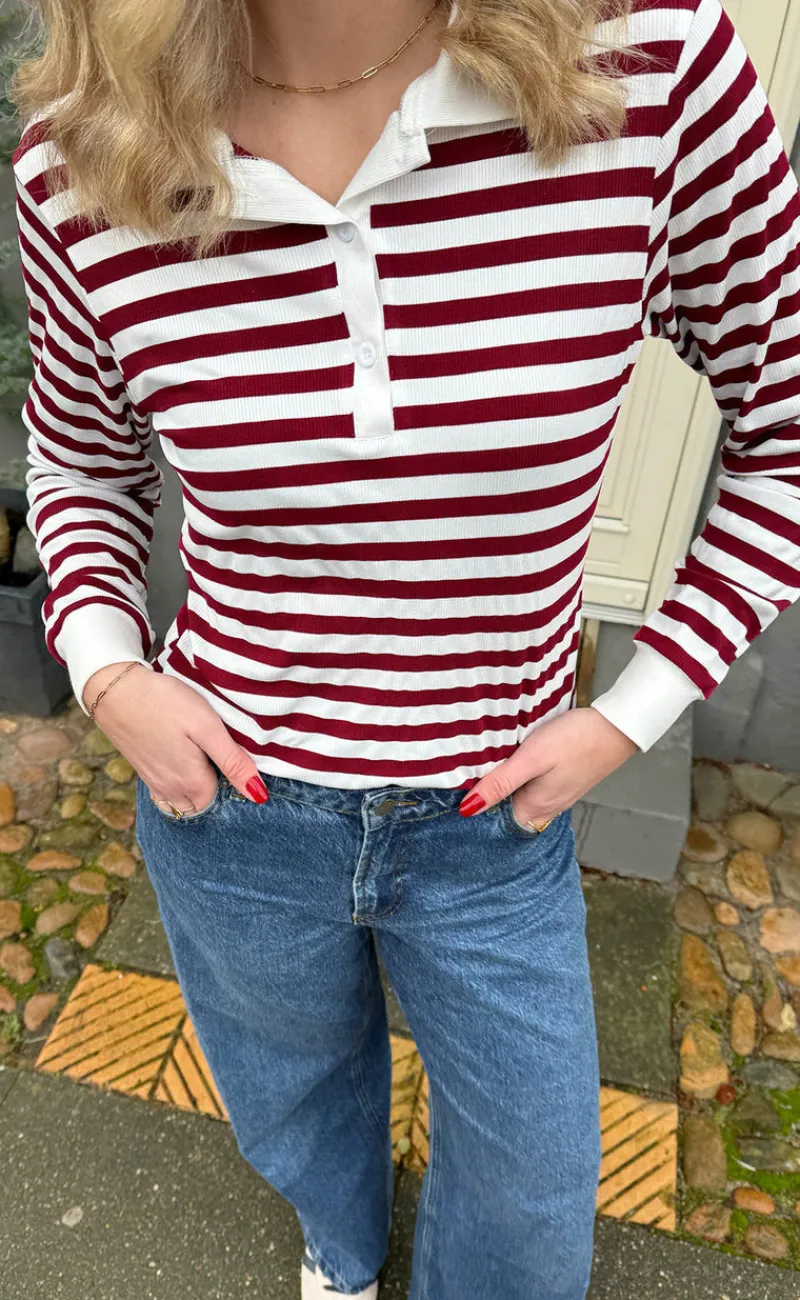 Smart polo fra INA Copenhagen med striber i bordeaux og off white.