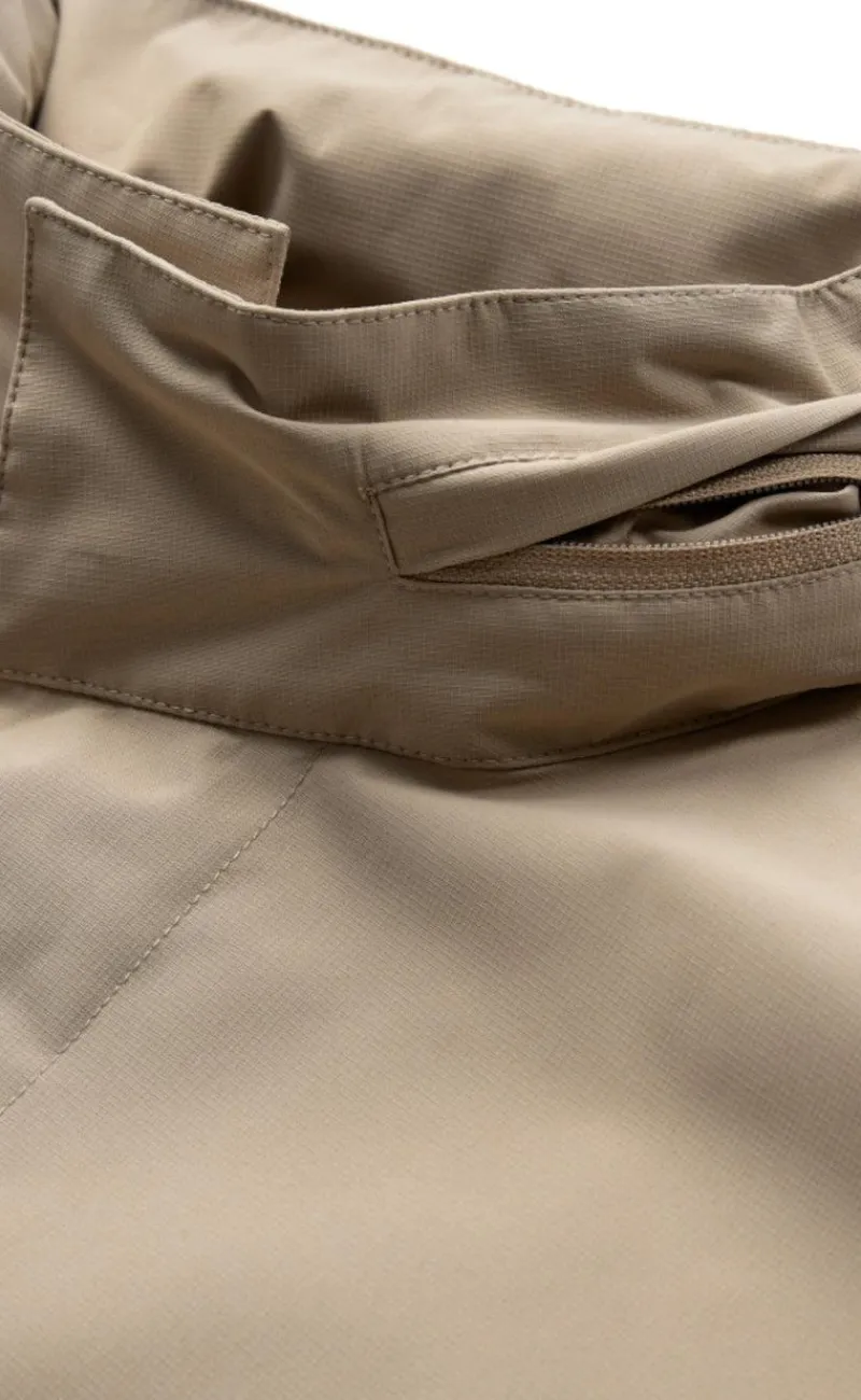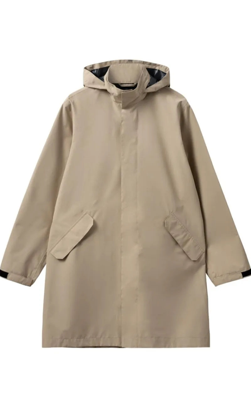 Regnjakken er en lang model med justerbar hætte, sidelommer med magnetlukning og en skjult knaplukning.