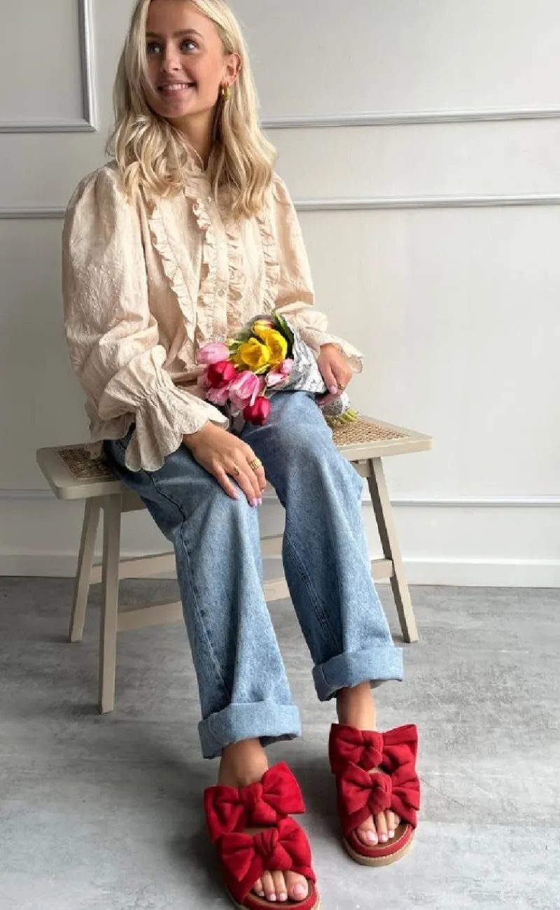 Disse sandaler kombinerer komfort med et stilrent design, der passer til de varme sommerdage. De har to store sløjfer på toppen.