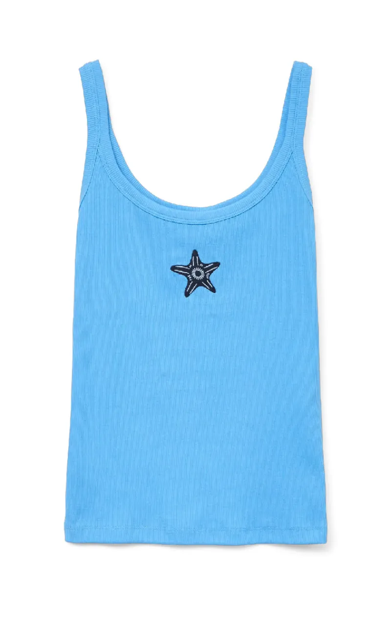 Ribbet top fra Vero Moda i blå med en søstjerne fortil.