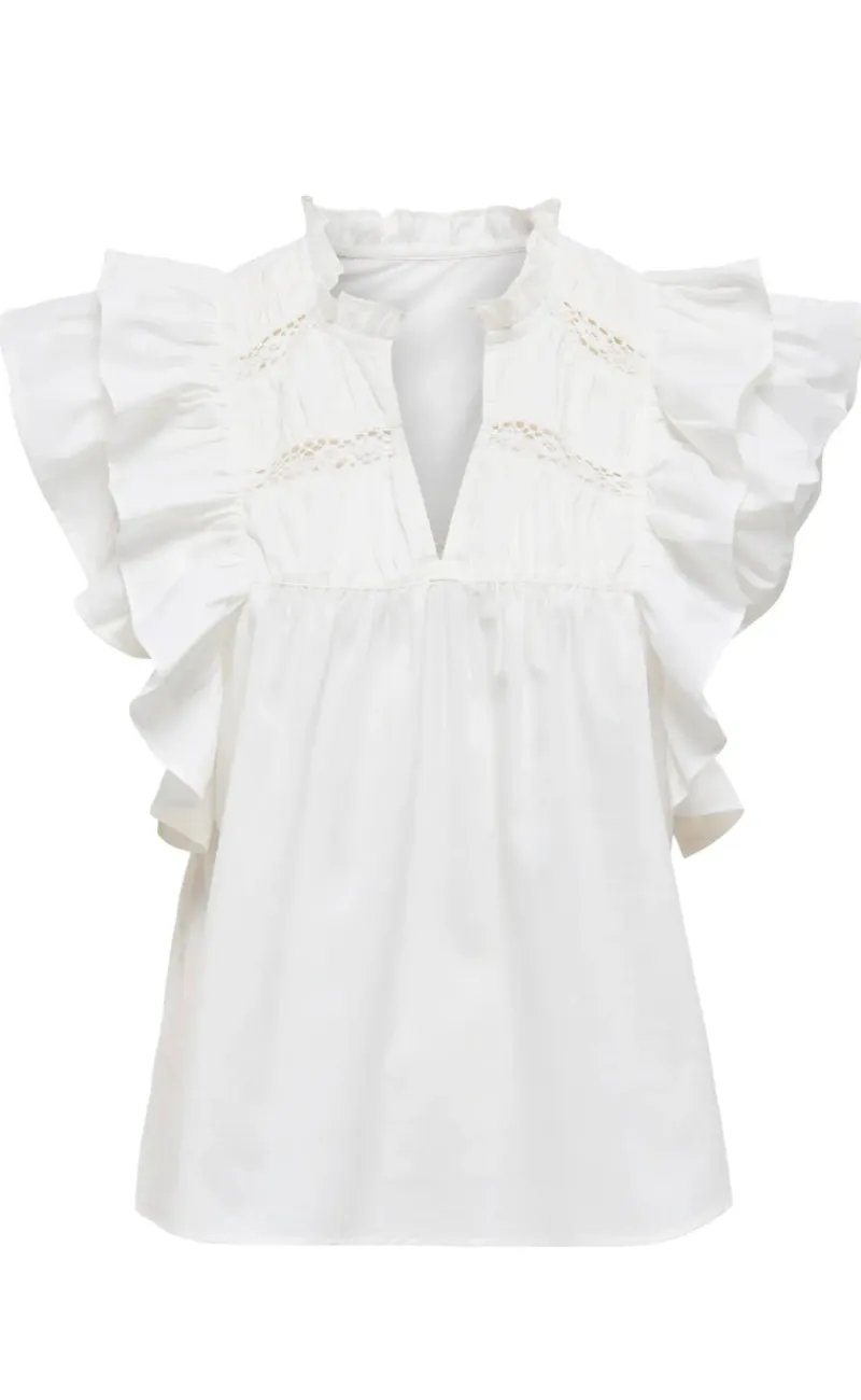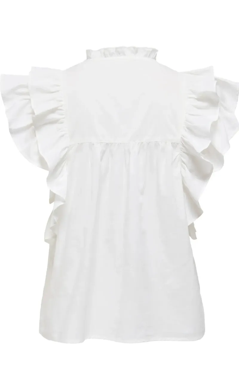 Toppen har en fin løs pasform og flæser ved ærmerne.