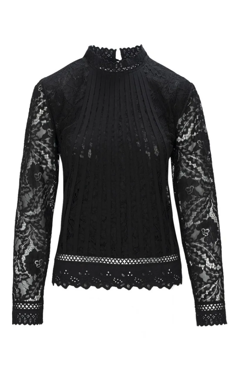 Blusen har blonde ærmer, høj blonde-hals og mange andre fine detaljer.