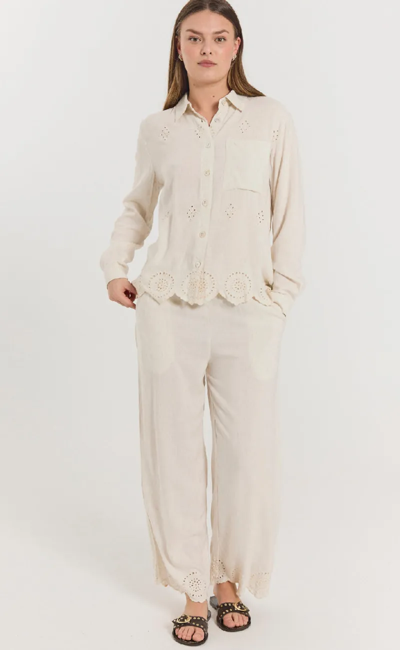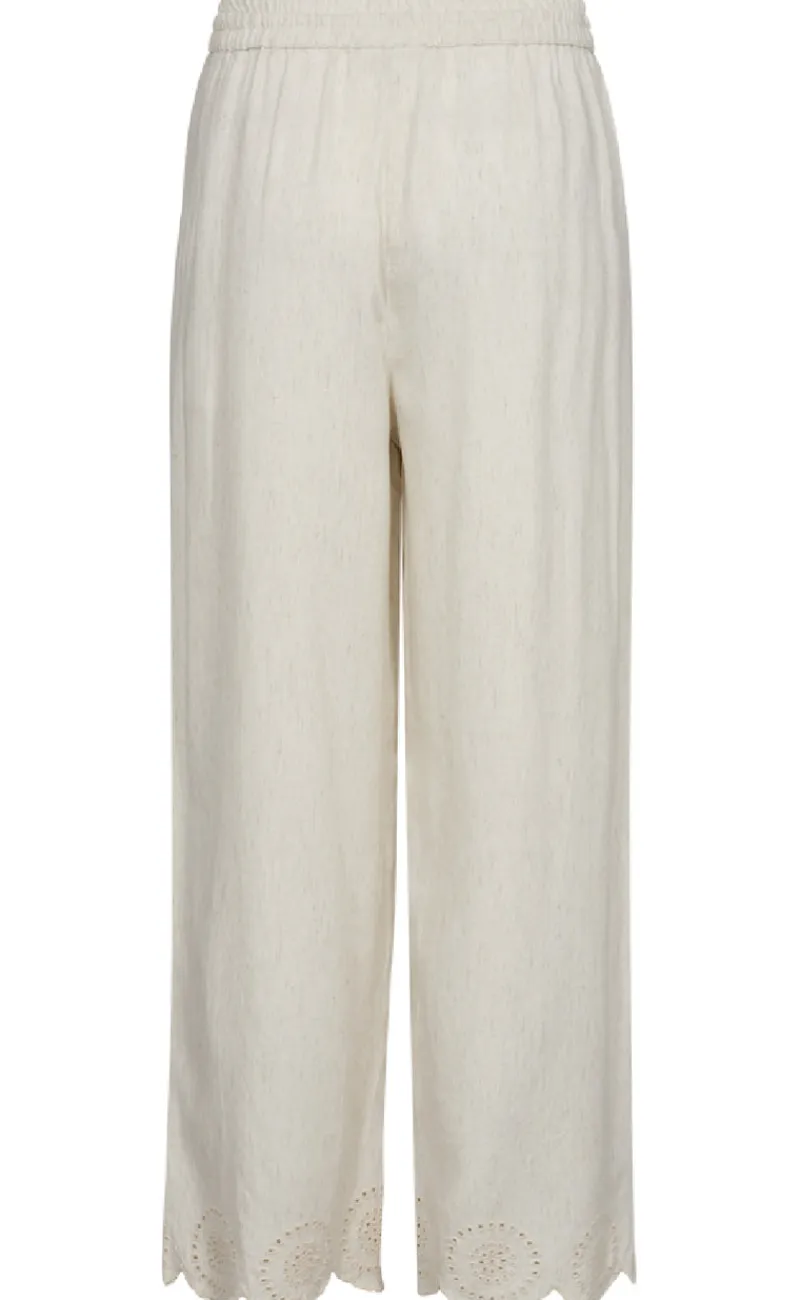 Beige bukser fra Freequent, i et flot print som har nogle fine broderi anglaise detaljer forneden.