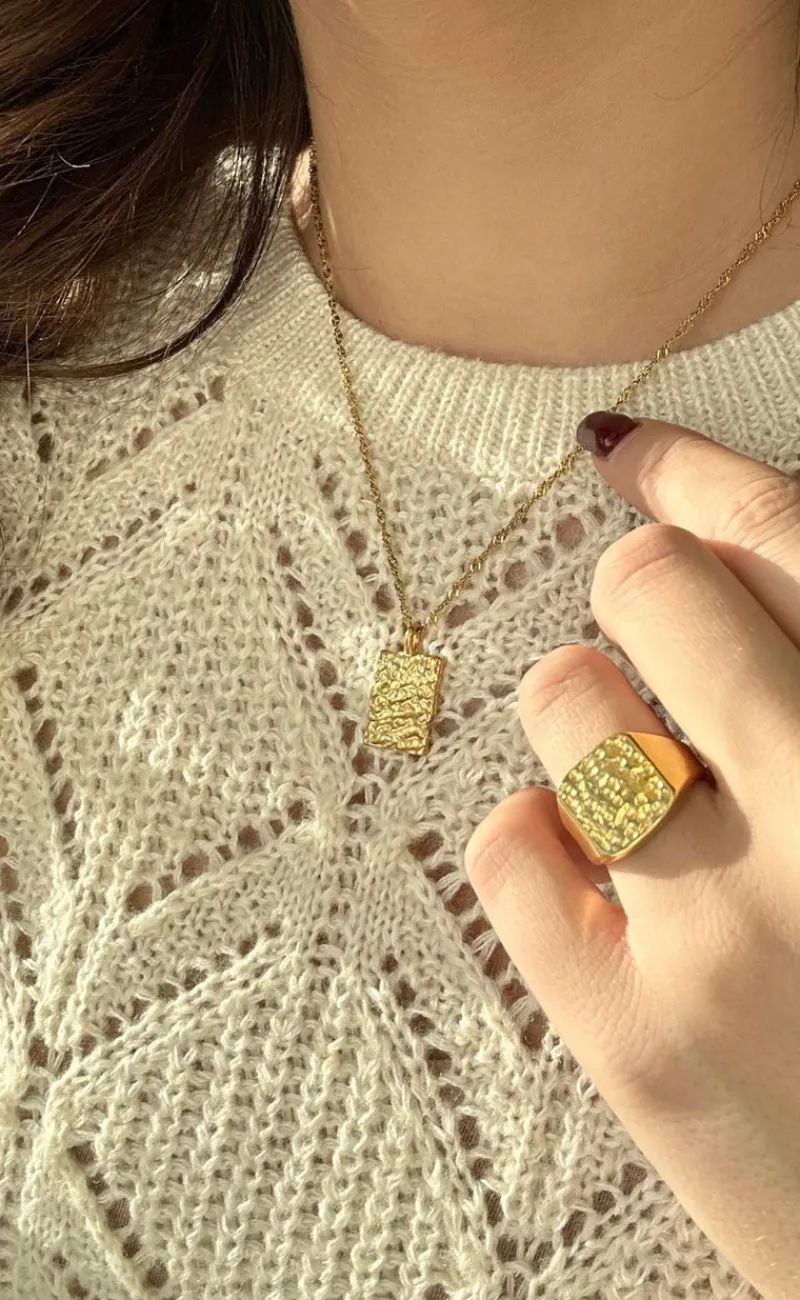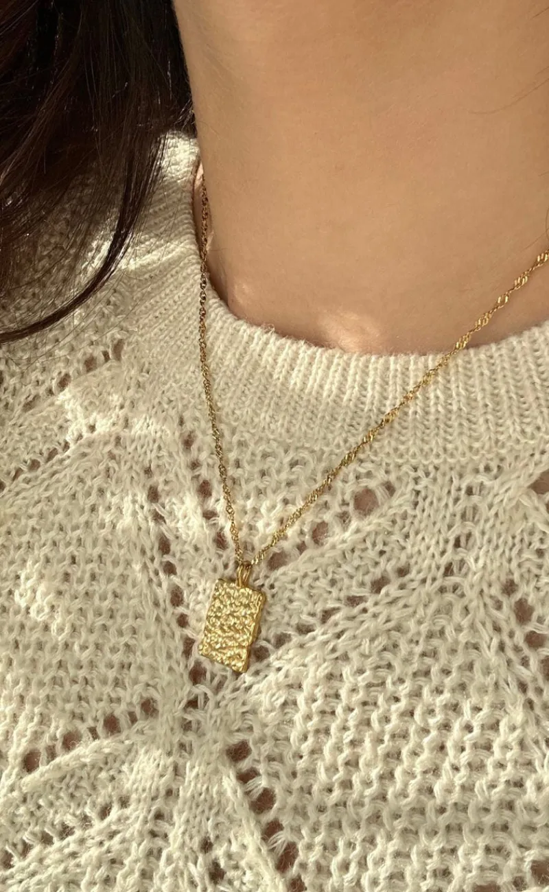 Flot halskæde fra Smykkeli Copenhagen i guld med et firkantet vedhæng, der har en hamret overflade. Den perfekte halskæde til både hverdag og særlige lejligheder!