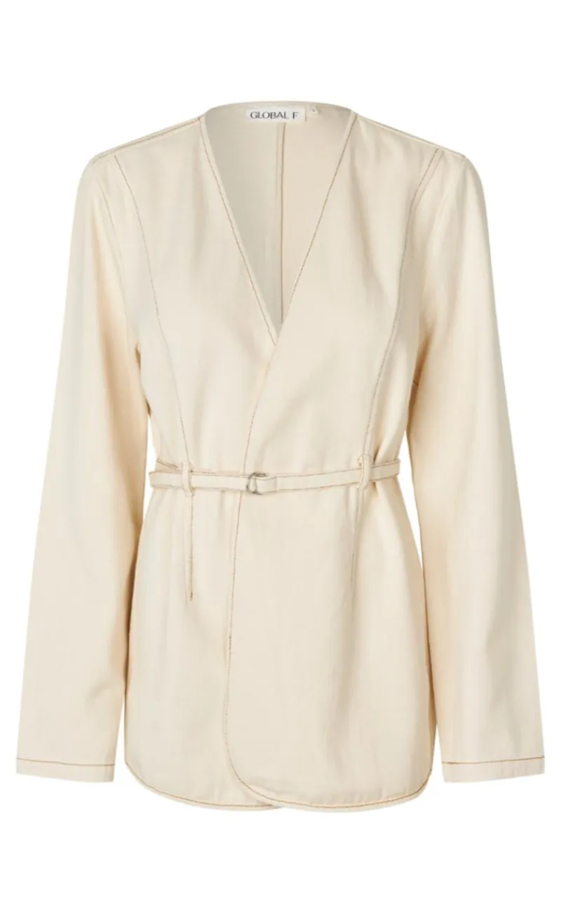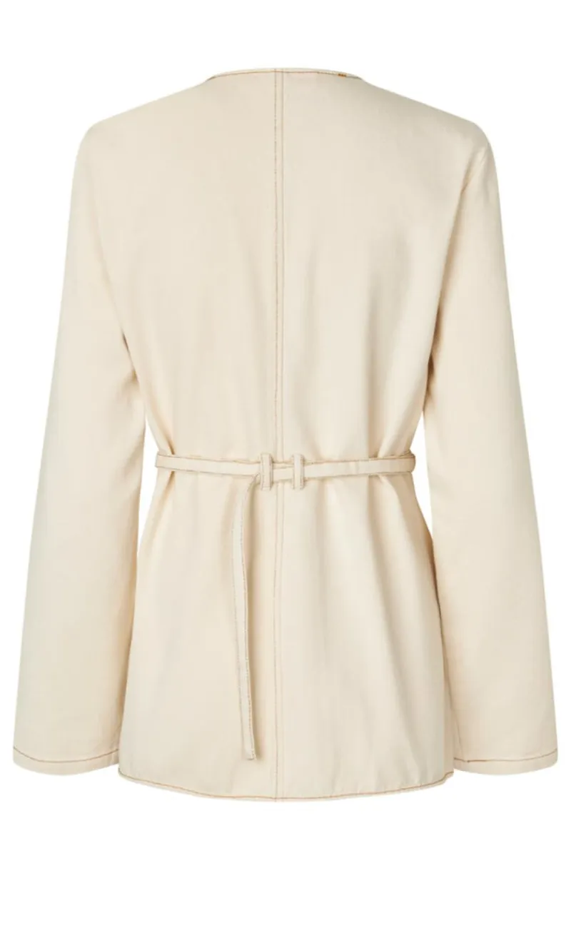 Denne jakke har en slå-om effekt og et bindebånd ved maven.