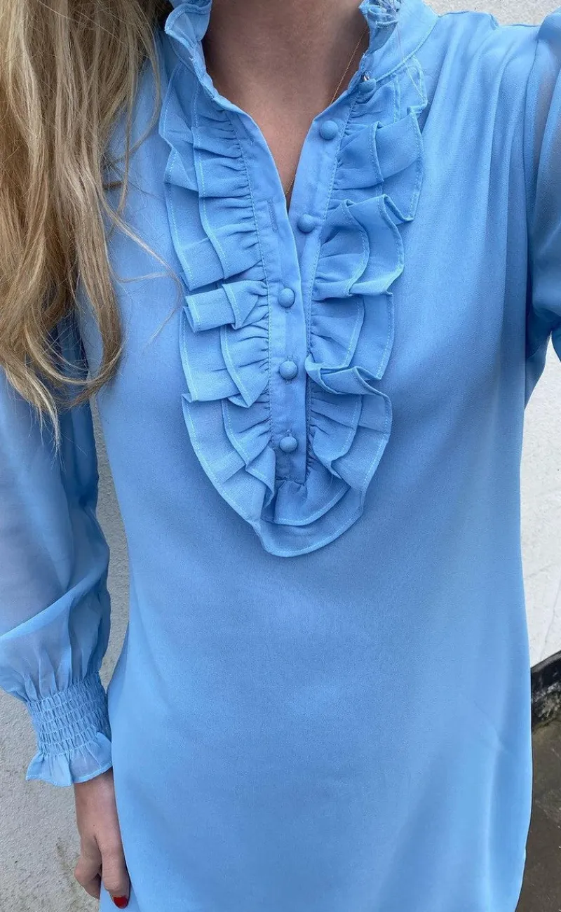 Smuk kjole fra INA Copenhagen i lyseblå med de fineste flæser fortil.