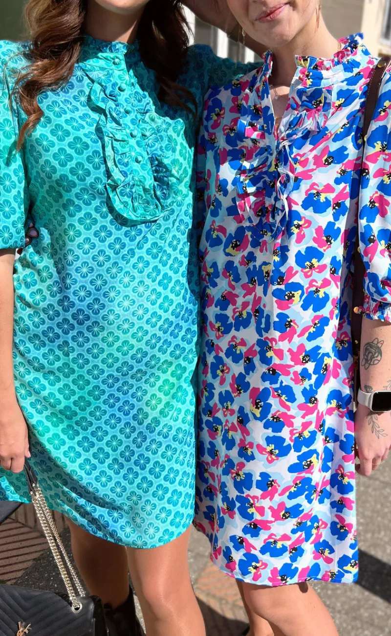 Smuk kjole fra INA Copenhagen med det fineste, symestriske blomstermønster og flæser fortil.