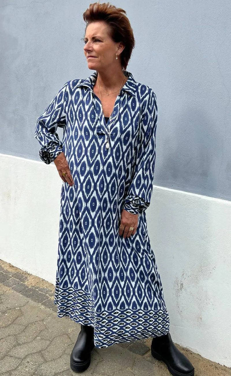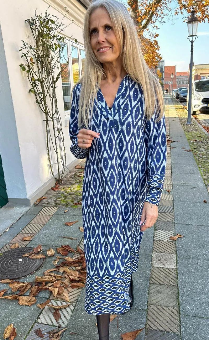 Flot kjole kjole fra INA Copenhagen med print i blå nuancer.
