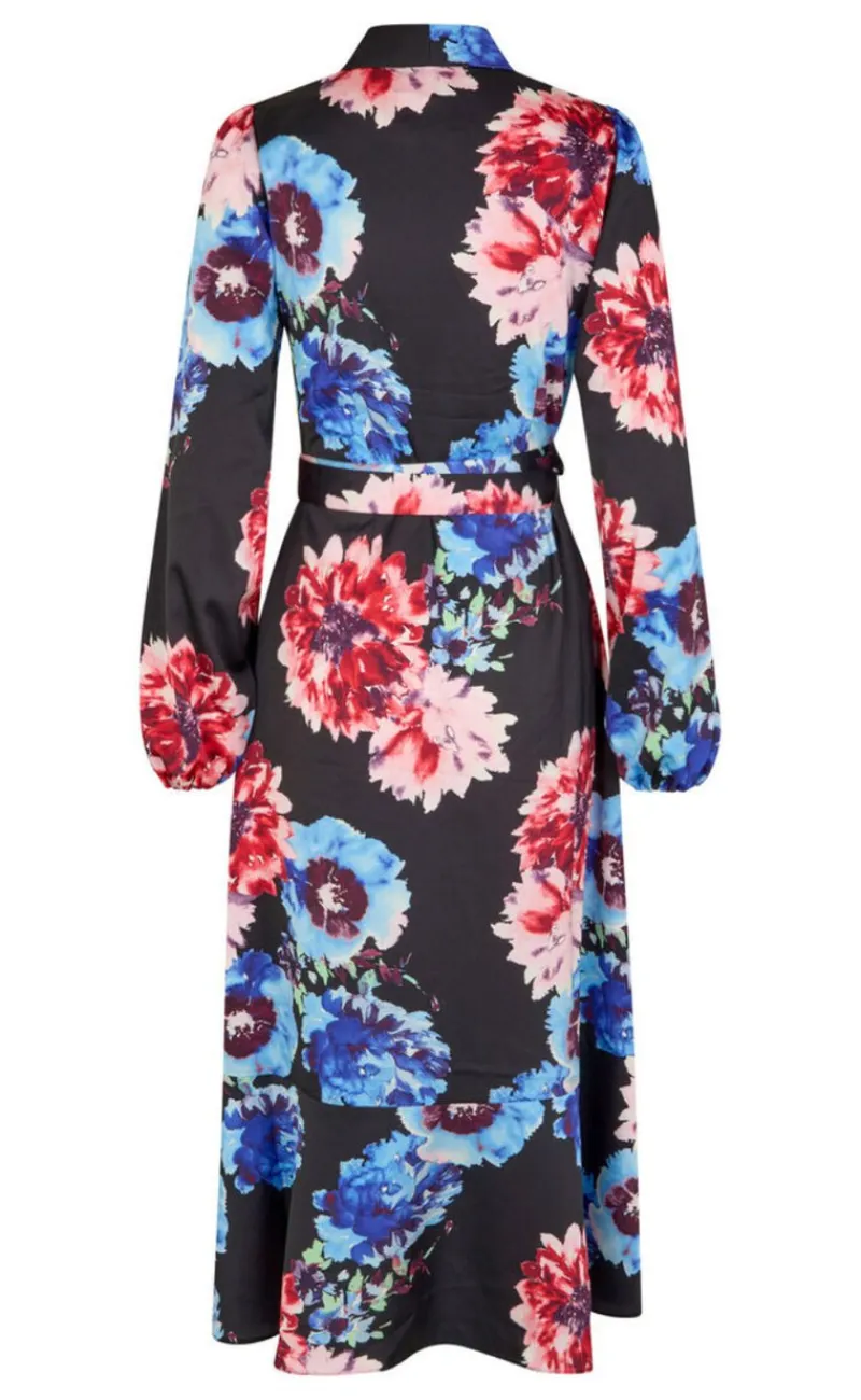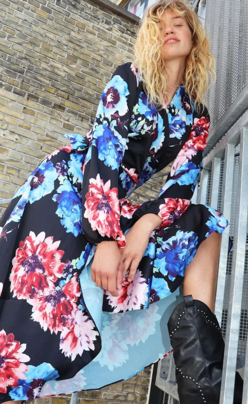 Flot, lang slå-om-kjole i cool print med flæsedetaljer forneden.