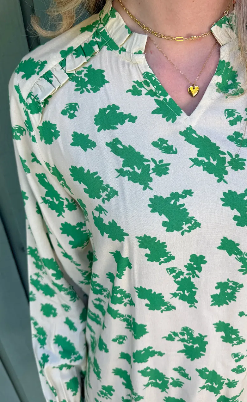Kjolen har lange ærmer med elastik omkring håndled, v-hals og en fin detalje med flæser ved skulderen.