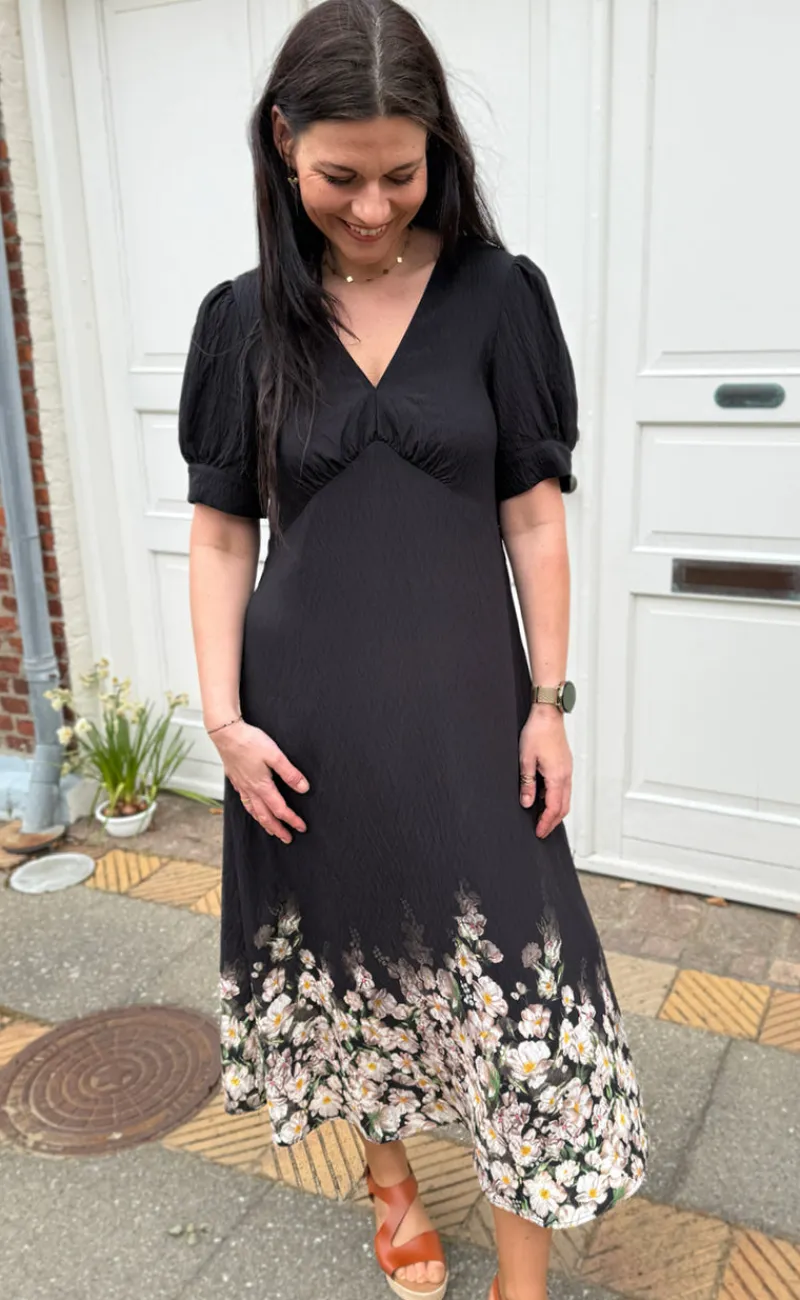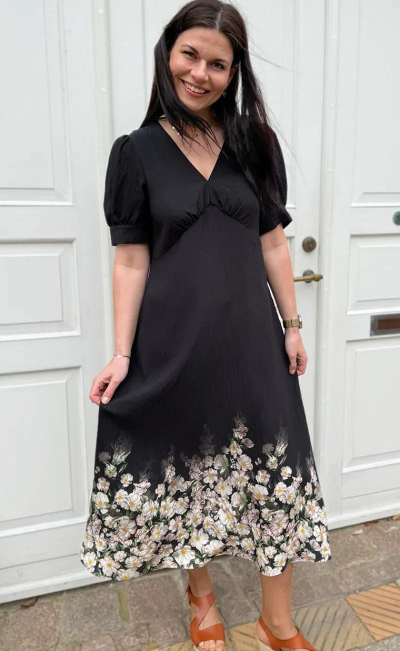 Smuk kjole fra INA Copenhagen i sort med det fineste blomsterprint nederst på kjolen.