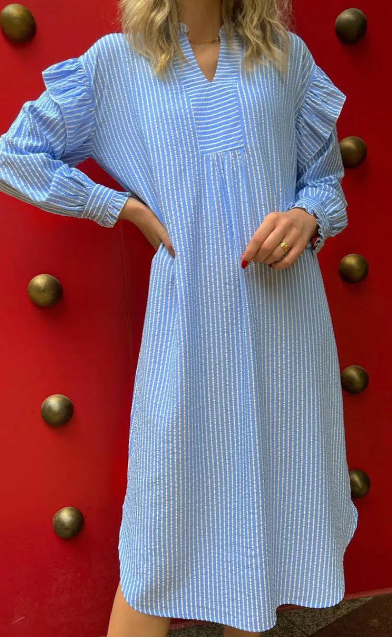 Smuk kjole fra INA Copenhagen med hvide og lyseblå striber.